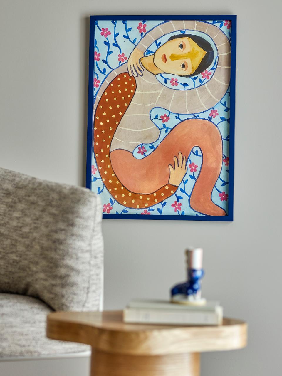 Ilustracja Floriesta w ramce marki Bloomingville to oprawiona w ramę dekoracja ścienna wydrukowana na papierze i osadzona w ciemnoniebieskiej ramie z drewna jodłowego, z płytą MDF i szkłem.Przedstawia stylizowaną postać na delikatnym tle kwiatowym w odcieniach różu i błękitu.Produkt wykonany jest z naturalnych materiałów – mogą występować różnice w kolorze, co czyni każdy egzemplarz unikatowym.