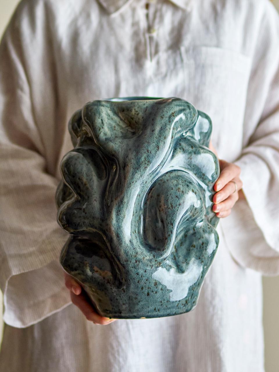 Wazon Vuelle firmy Bloomingville, wykonany z kamionki, charakteryzuje się organicznym i przestronnym designem. Jego powierzchnia jest pokryta ciemnoszarą reaktywną glazurą, co nadaje każdemu wazonowi niepowtarzalny wygląd, gwarantując, że nie ma dwóch identycznych. Ten wyjątkowy design sprawia, że wazon idealnie nadaje się jako samodzielny element dekoracyjny lub elegancki wazon na kompozycje kwiatowe. Umieść go w kuchni lub salonie, aby dodać stylowego i nowoczesnego akcentu do swojego wystroju.