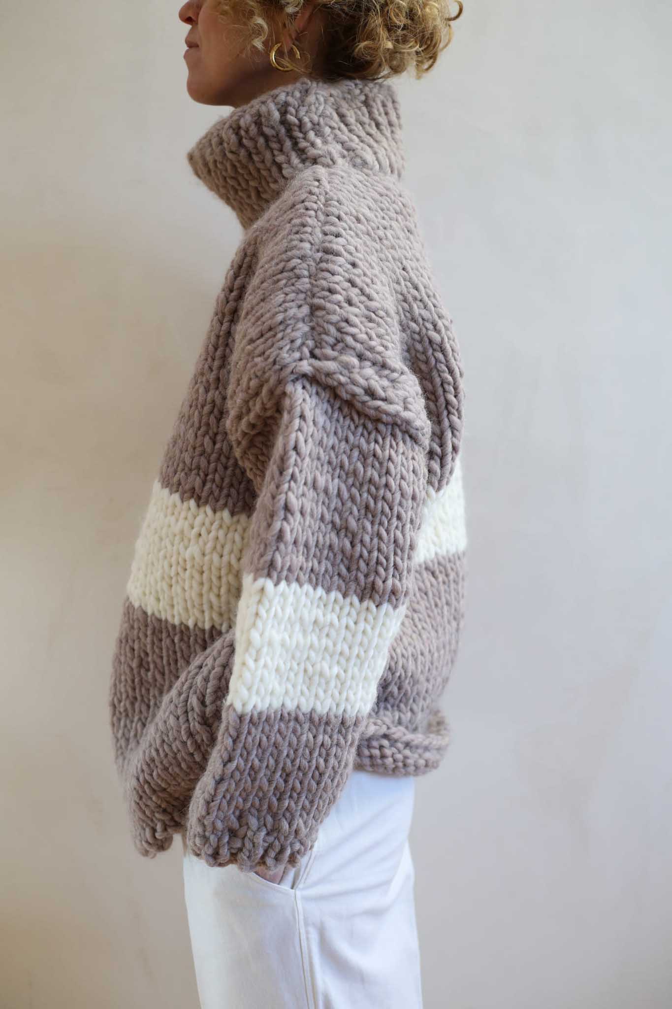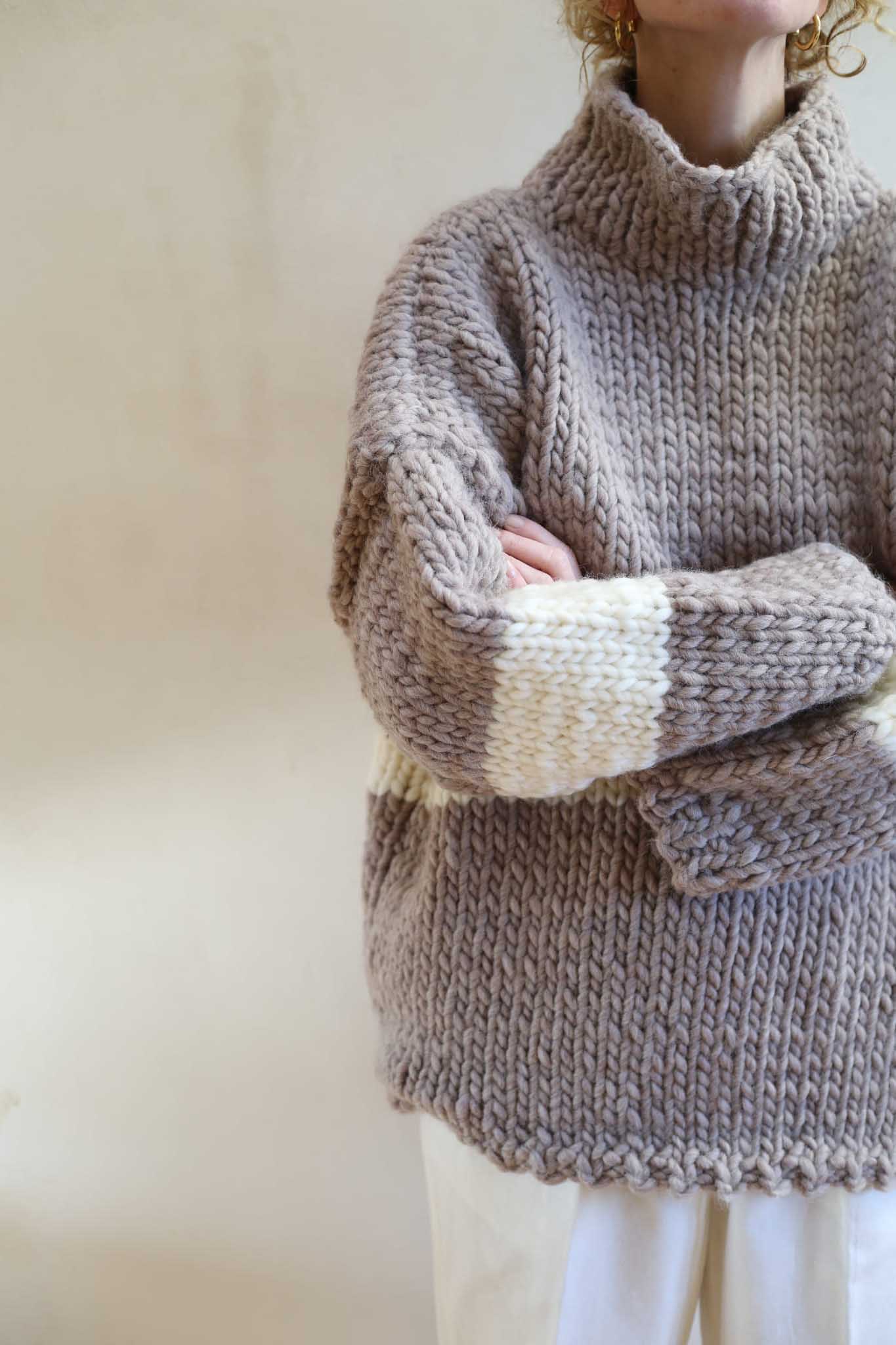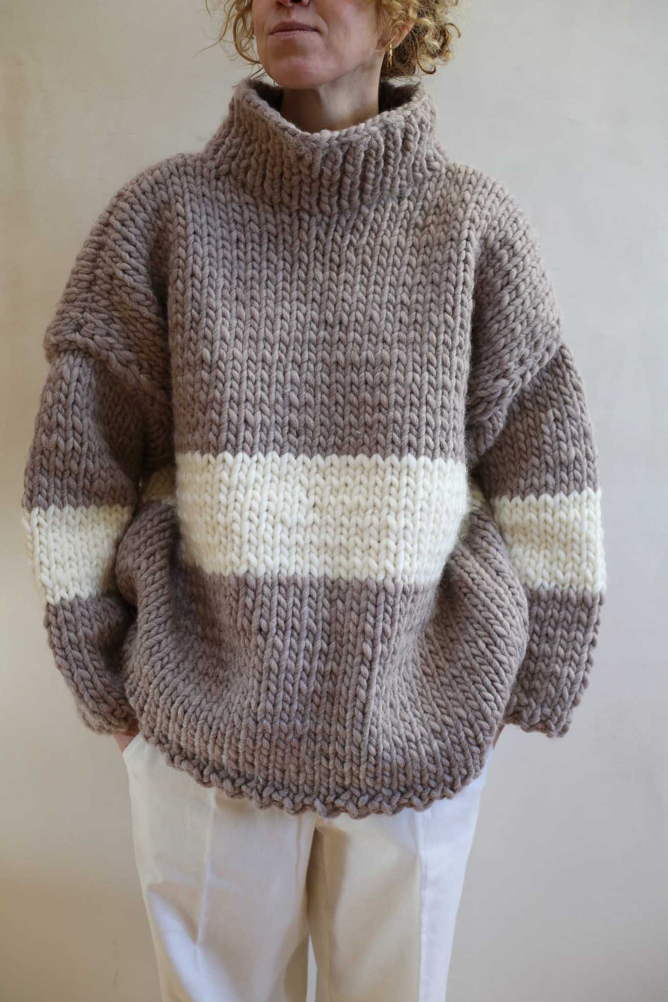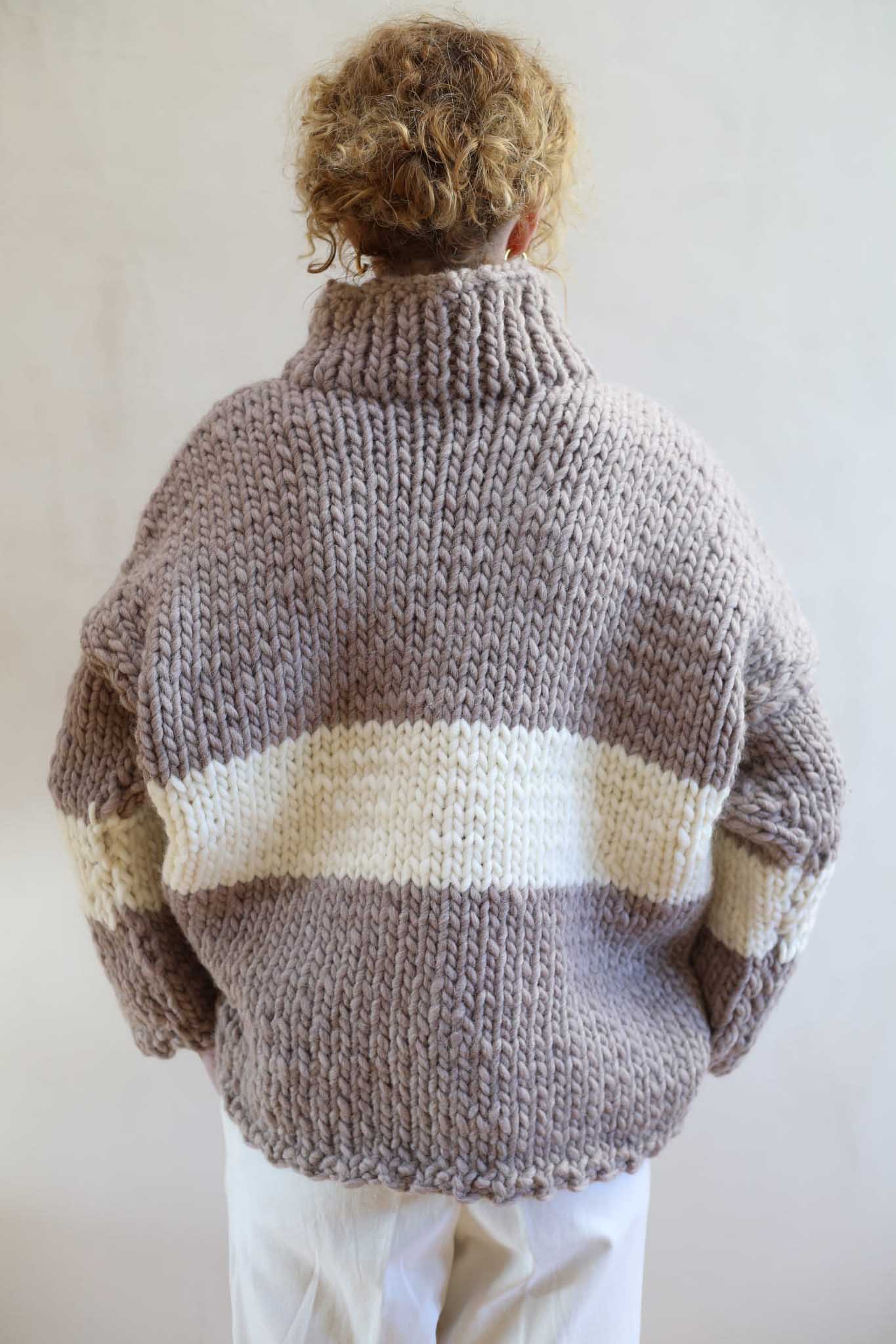 Model Grace to klasyczny, minimalistyczny golf z prostymi rękawami, opuszczonymi ramionami. Mięsisty, wyrazisty ścieg nadaje mu charakteru. Kolor szlachetności i neutralności. Luźny krój współgra z wieloma elementami z szafy. Ręcznie dziergany stanowi wyjątkowy akcent w szafie.