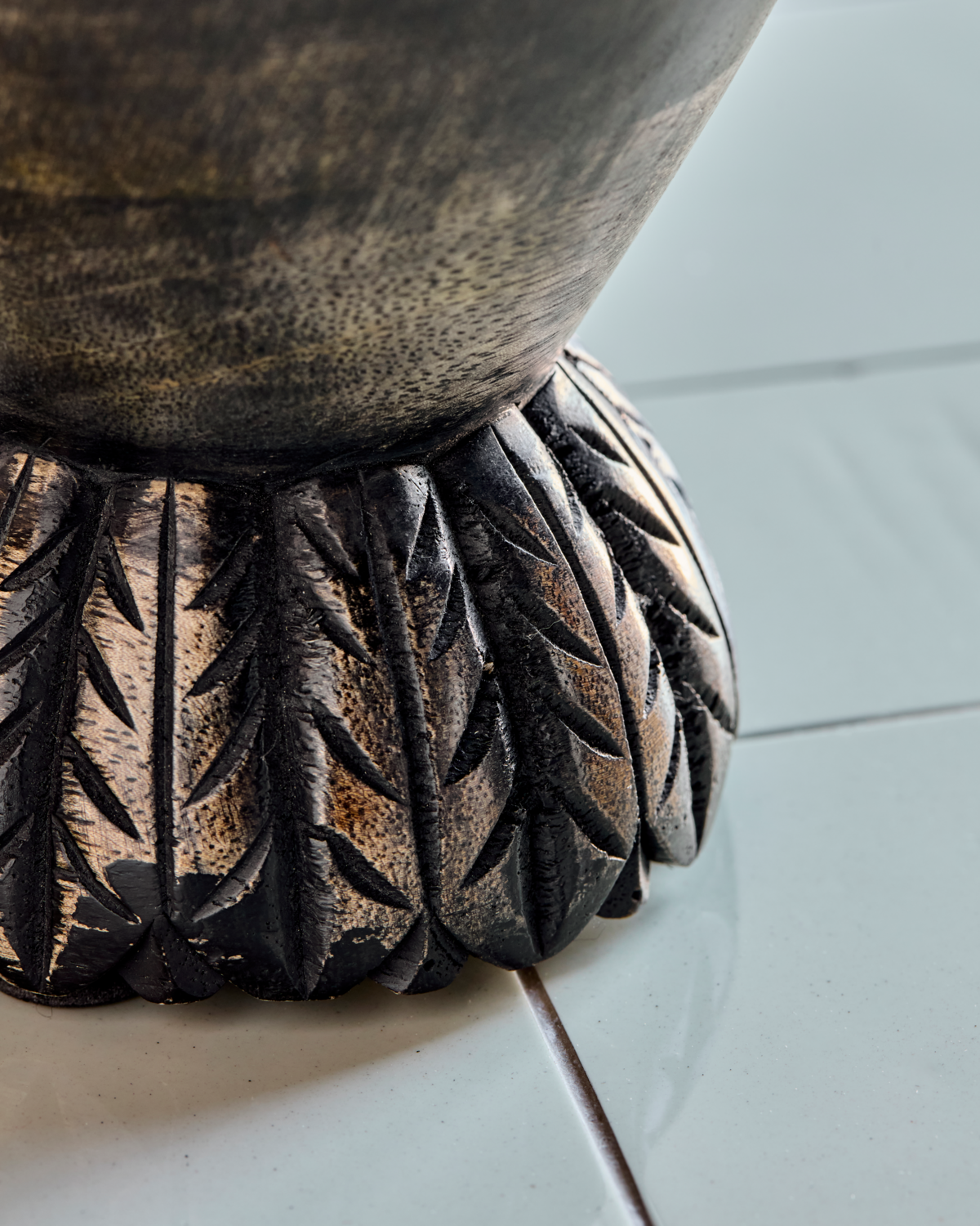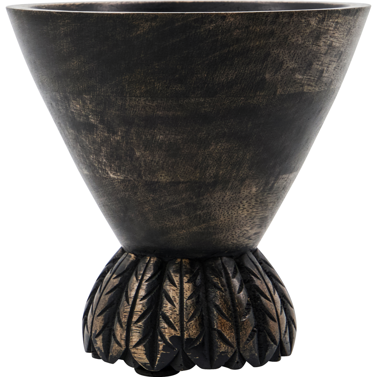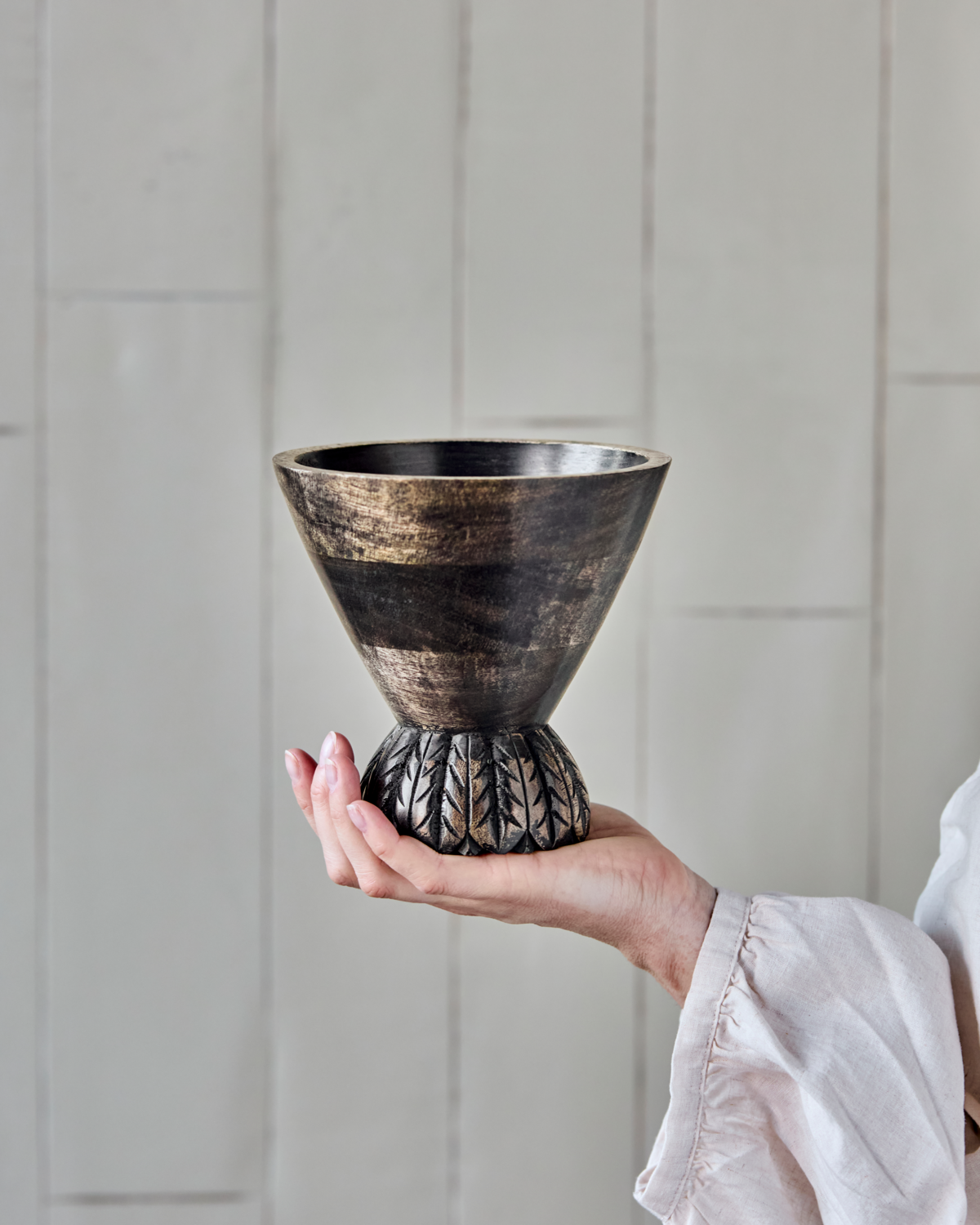 Wprowadź rustykalny akcent do swojego domu dzięki tej ręcznie robionej donicy z bejcowanego na czarno drewna mango. Jej stożkowaty kształt i solidna podstawa nadadzą Twojemu wnętrzu rzeźbiarski charakter, zarówno na stole w jadalni, jak i na kredensie. Skomponuj ją ze swoimi ulubionymi przedmiotami lub dodaj odrobinę natury, umieszczając w niej rośliny doniczkowe. - Ręczne wykonanie - Bejcowane na czarno drewno mango - Dekoracyjny stożkowy kształt - Wszechstronne możliwości stylizacji Pozwól swojej kreatywności zabłysnąć, tworząc samodzielny element centralny lub wypełniając go zielenią
