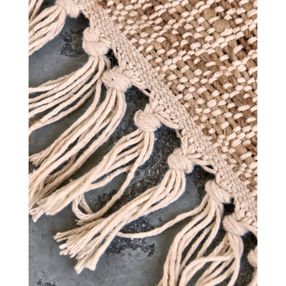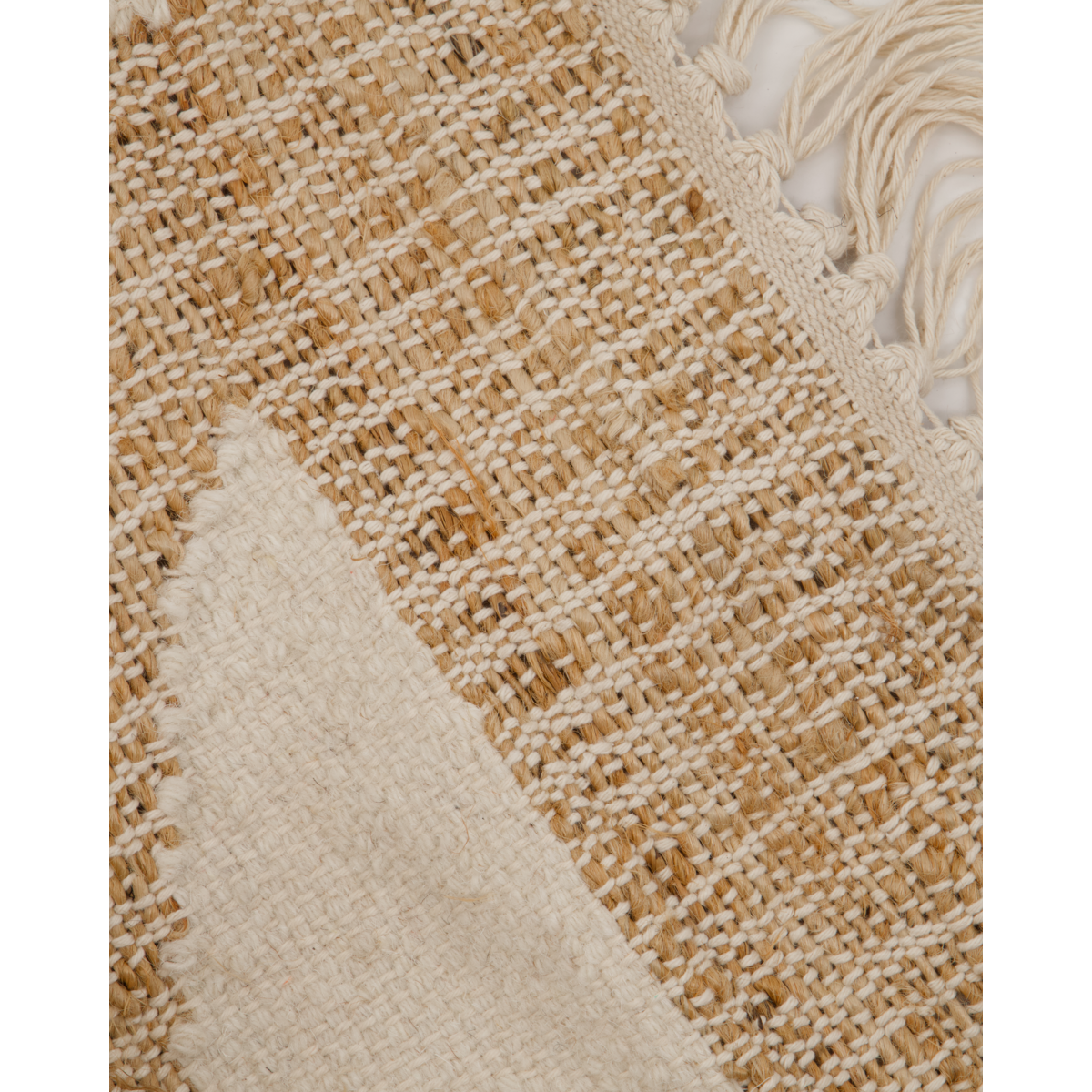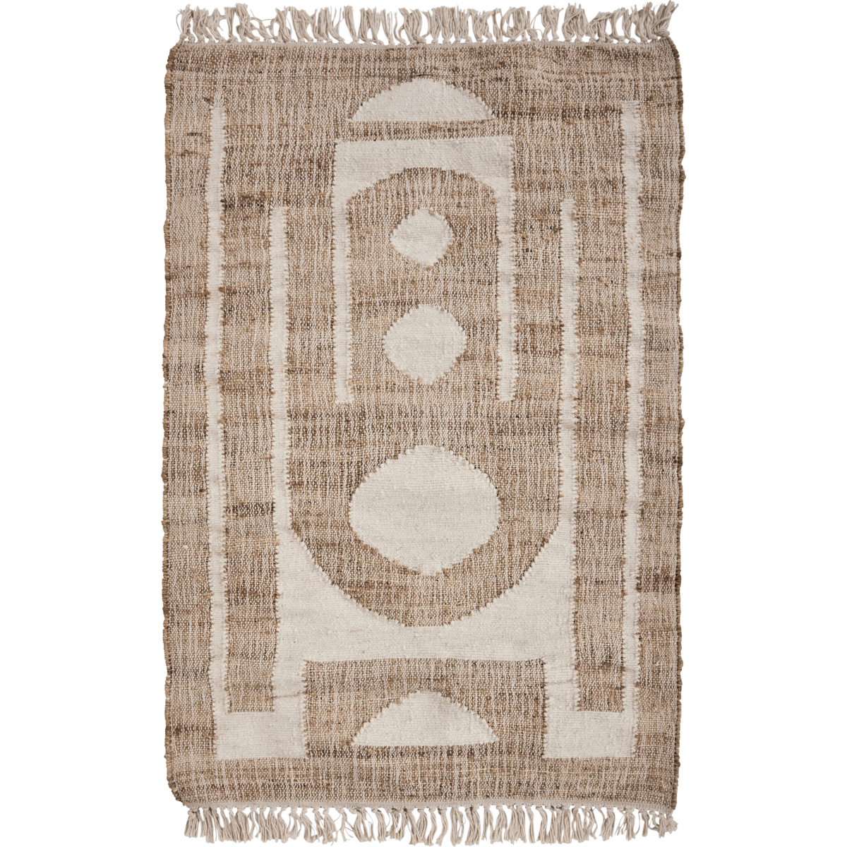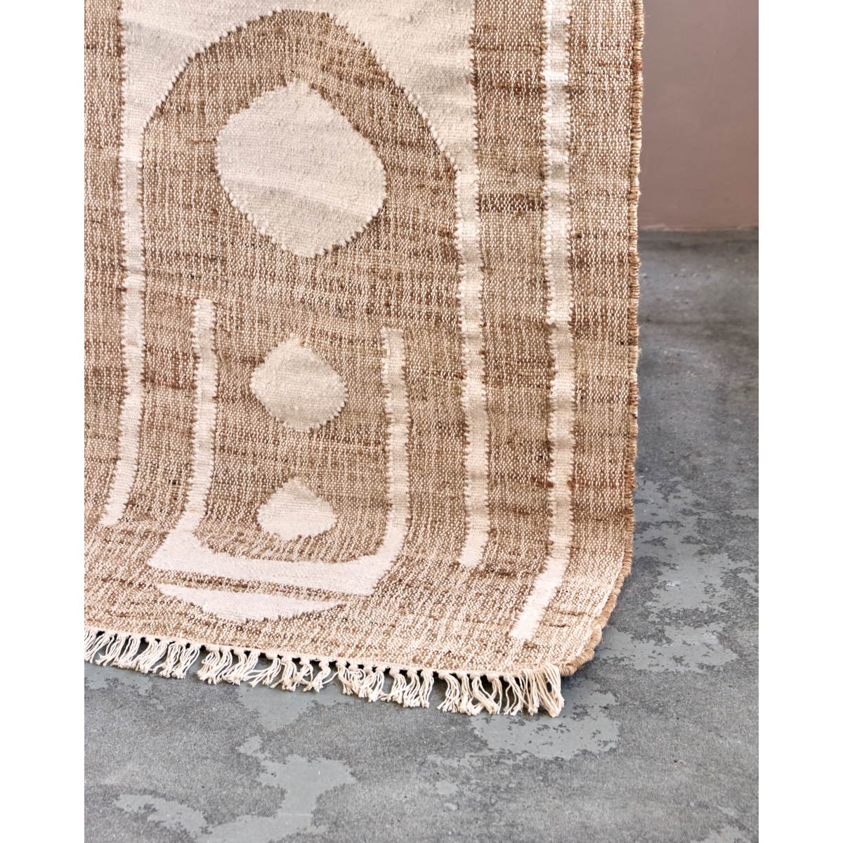 Dywan HDRostro Narure. Ręcznie wykonany z najwyższą dbałością o szczegóły, ten dywan wnosi ciepło i styl do Twojej przestrzeni życiowej.Wykonany z mieszanki wełny, juty i bawełny, ma naturalny odcień z nowoczesnym, écru graficznym wzorem.Misterny wzór i frędzlowane krawędzie sprawiają, że jest to wszechstronny element, zarówno położony na podłodze, jak i eksponowany jako dekoracja ścienna.Jego estetyczny wygląd i przytulny urok sprawiają, że jest to idealny dodatek do przedpokoju lub salonu.- Ręcznie wykonana mieszanka wełny/juty/bawełny - Naturalny kolor z graficznym wzorem - Uniwersalny - podłoga lub ściana - Dodaje ciepła i faktury Wprowadź ten stylowy element do wystroju swojego domu, aby uzyskać idealne połączenie funkcjonalności i designu