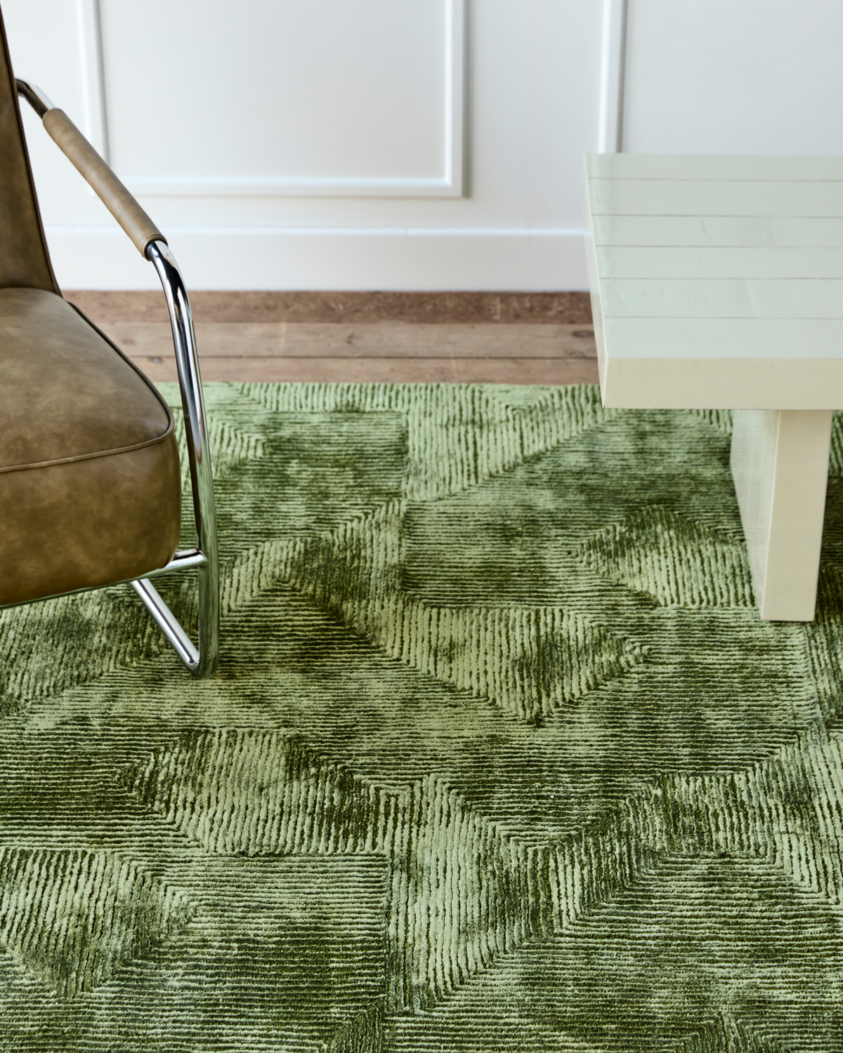 Dodaj subtelną nutę luksusu do swojego domu dzięki temu ręcznie robionemu, zielonemu dywanowi. Lśniąca powierzchnia i wyrafinowany, graficzny wzór odbijają światło, tworząc wyrafinowany akcent w każdym pomieszczeniu. Umieść go w salonie lub sypialni, aby cieszyć się miękką fakturą pod stopami, lub wykorzystaj jako unikalną dekorację ścienną, aby uzyskać odważny, dekoracyjny akcent. - Ręcznie wykonany dla najwyższej jakości