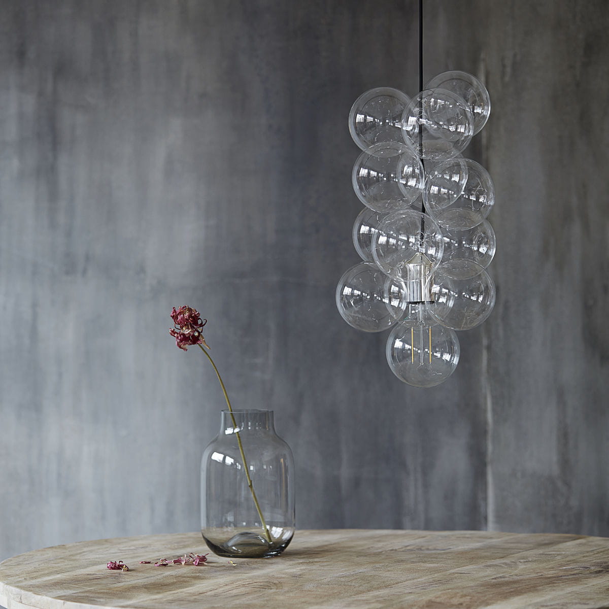 Lampa wisząca DIY Buble z House Doctor. Lampa składa się z 12 przezroczystych szklanych kul, które razem tworzą wspaniałą kompozycje, jak rzeźbę wiszącą w górze. Każda ze szklanych kul jest zawieszona na kablu w pionie lampy. Lampa ma bardzo nowoczesny design. Będzie pasować wszędzie. W roku salonu, korytarzu, nad jadalnianym stołem, w domowej antresoli czy tam, gdzie będzie potrzebne dodatkowy akcent światła. Lampa jest w zapakowana w ładną torbę płócienną. Żarówki nie są dołączone do zestawu. Zdjęcia poglądowe dodatkowo Pinterest.