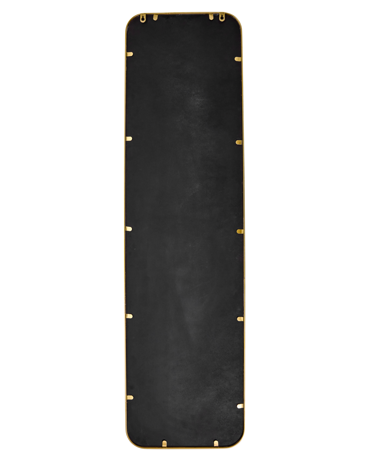 Odśwież swoją przestrzeń dzięki temu eleganckiemu lustru w złotej ramie, które łączy elegancję z minimalistycznym designem. Smukły profil i zaokrąglone rogi tworzą wyrafinowaną sylwetkę, a lśniące złote wykończenie doda każdemu wnętrzu odrobinę ciepła i elegancji.