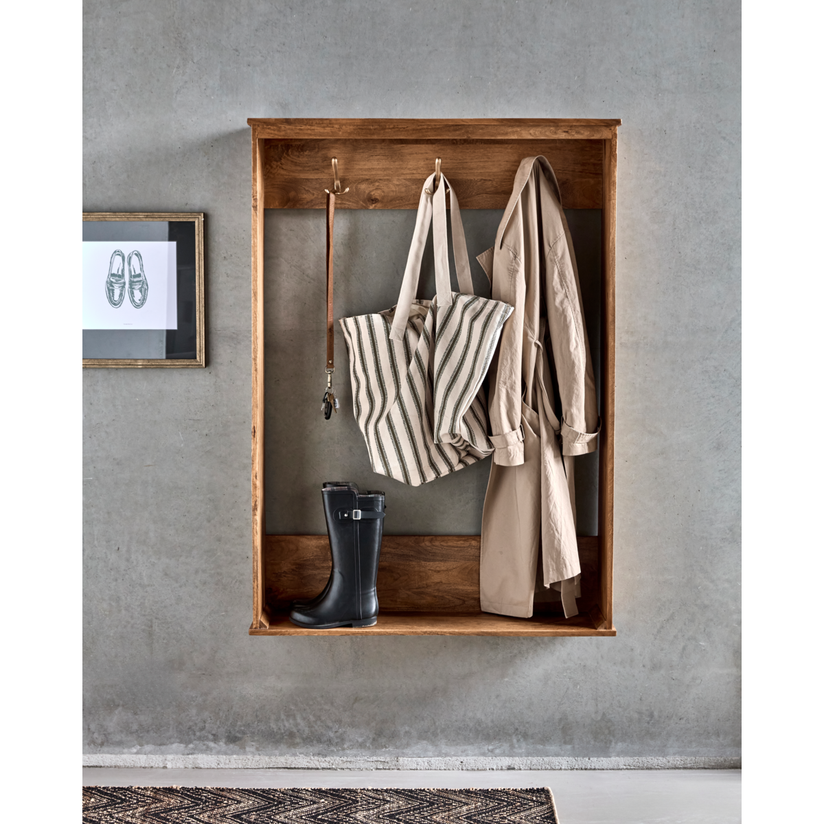 Ten pięknie wykonany wieszak na ubrania z drewna mango i wykończeniem w kolorze antycznego brązu wnosi do Twojego domu zarówno styl, jak i praktyczność. Jego ponadczasowy design z wyrafinowanymi rowkowanymi panelami bocznymi oferuje wyrafinowane rozwiązanie do przechowywania odzieży wierzchniej, koszy i toreb. Idealny do przedpokoju lub sypialni, łączy elegancję z funkcjonalnością, aby utrzymać przestrzeń w porządku.- Wykonany z drewna mango - Wykończenie w kolorze antycznego brązu - Wyrafinowane rowkowane panele - Idealny do przedpokoju lub sypialni Zorganizuj swój dom dzięki temu eleganckiemu rozwiązaniu do przechowywania. Rozmiar: wys.: 141 cm, szer.: 100 cm, gł.: 20 cm Materiał: Główny: Drewno mango (100%) Małe części: Mosiądz (100%) Montaż: Nie wymaga montażu Może się różnić: Wykończenie, Kolor Masa netto: 14,85 kg Ogólne czyszczenie: Czyścić wilgotną szmatką