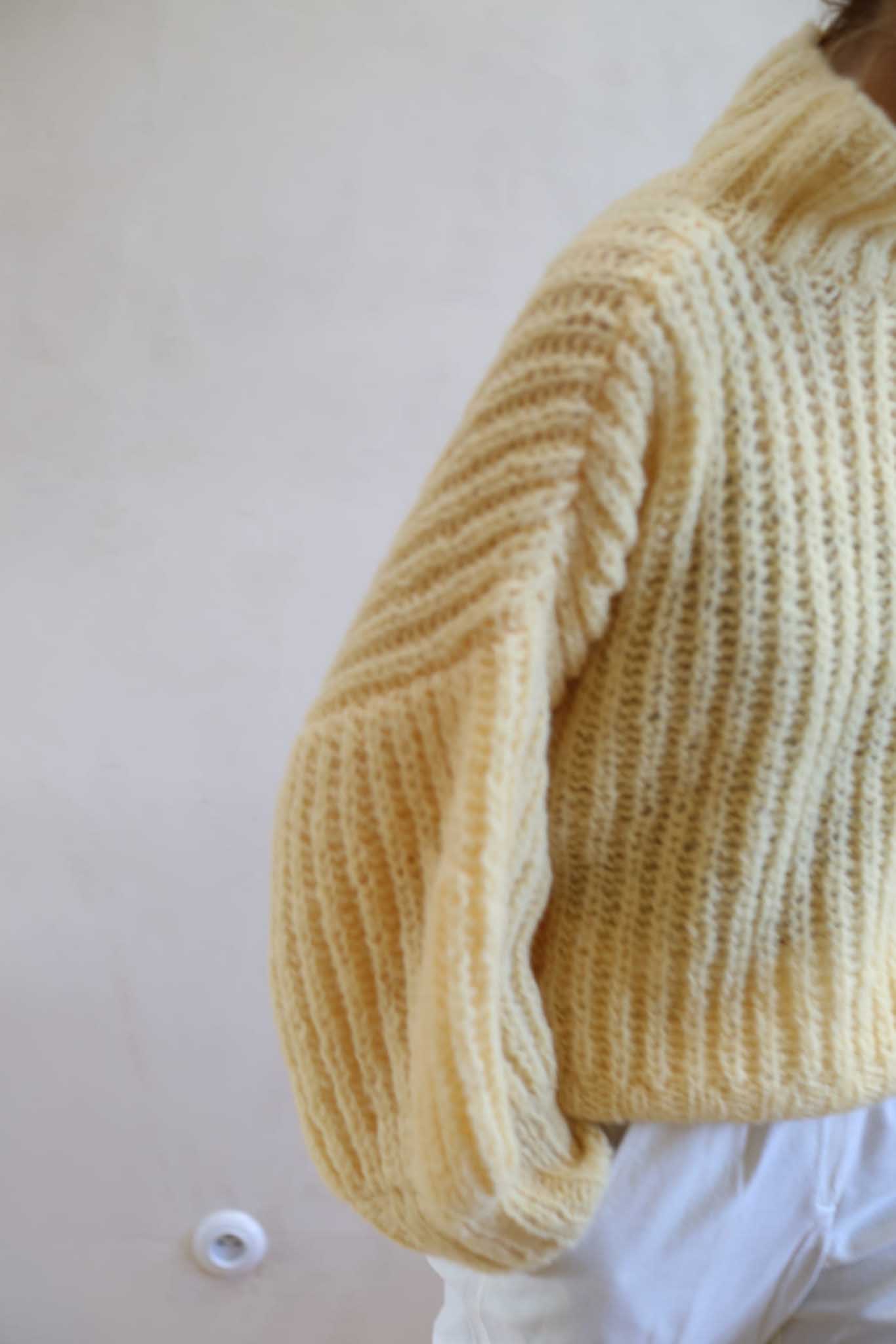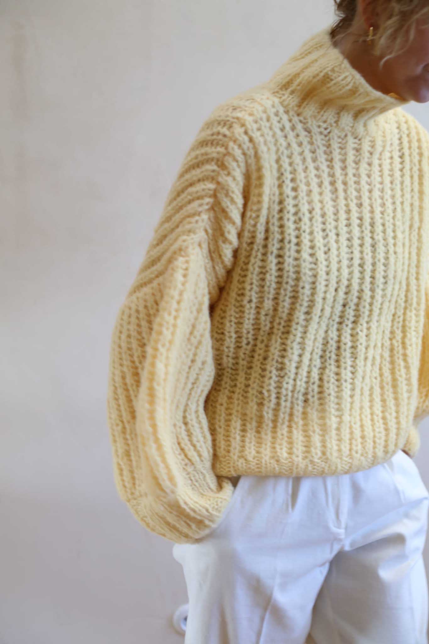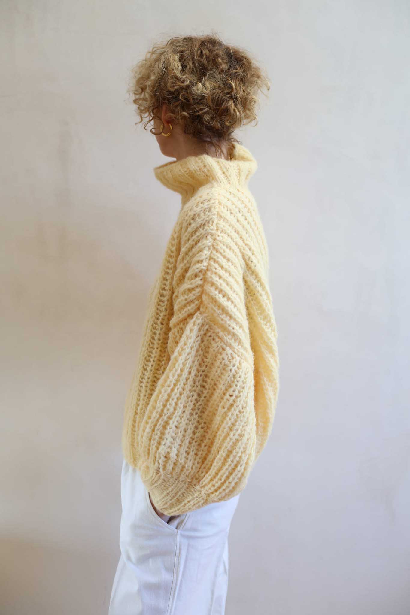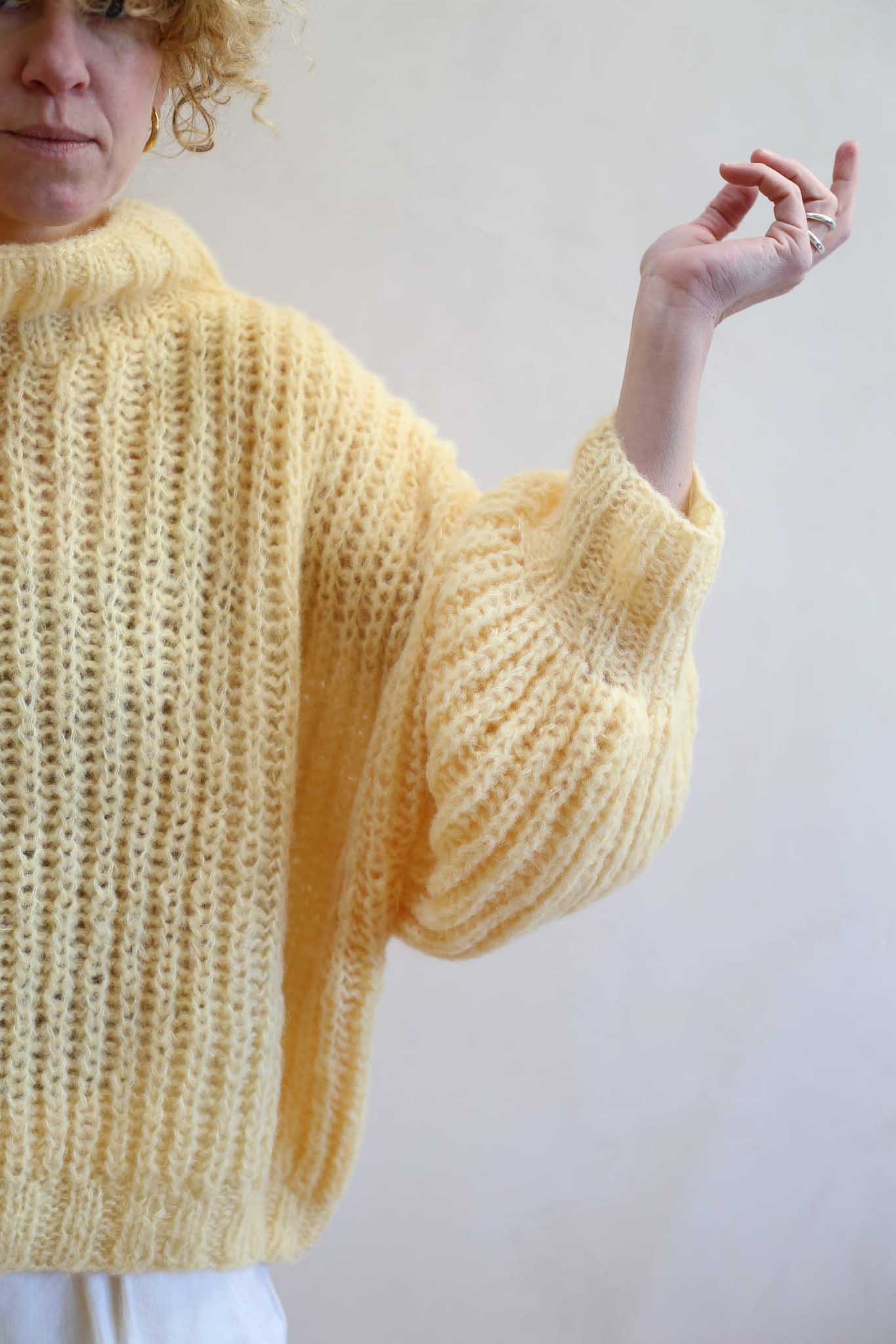 Model Lily Butter to uwspółcześniony, krótki golf z bufiastymi rękawami, długim mankietem, opuszczonymi ramionami i ściągaczem w pasie. Miękki, szlachetny, dzięki puszystej wełnie wygląda bardzo elegancko i ponadczasowo. Jest letnią wersja modelu Lily.