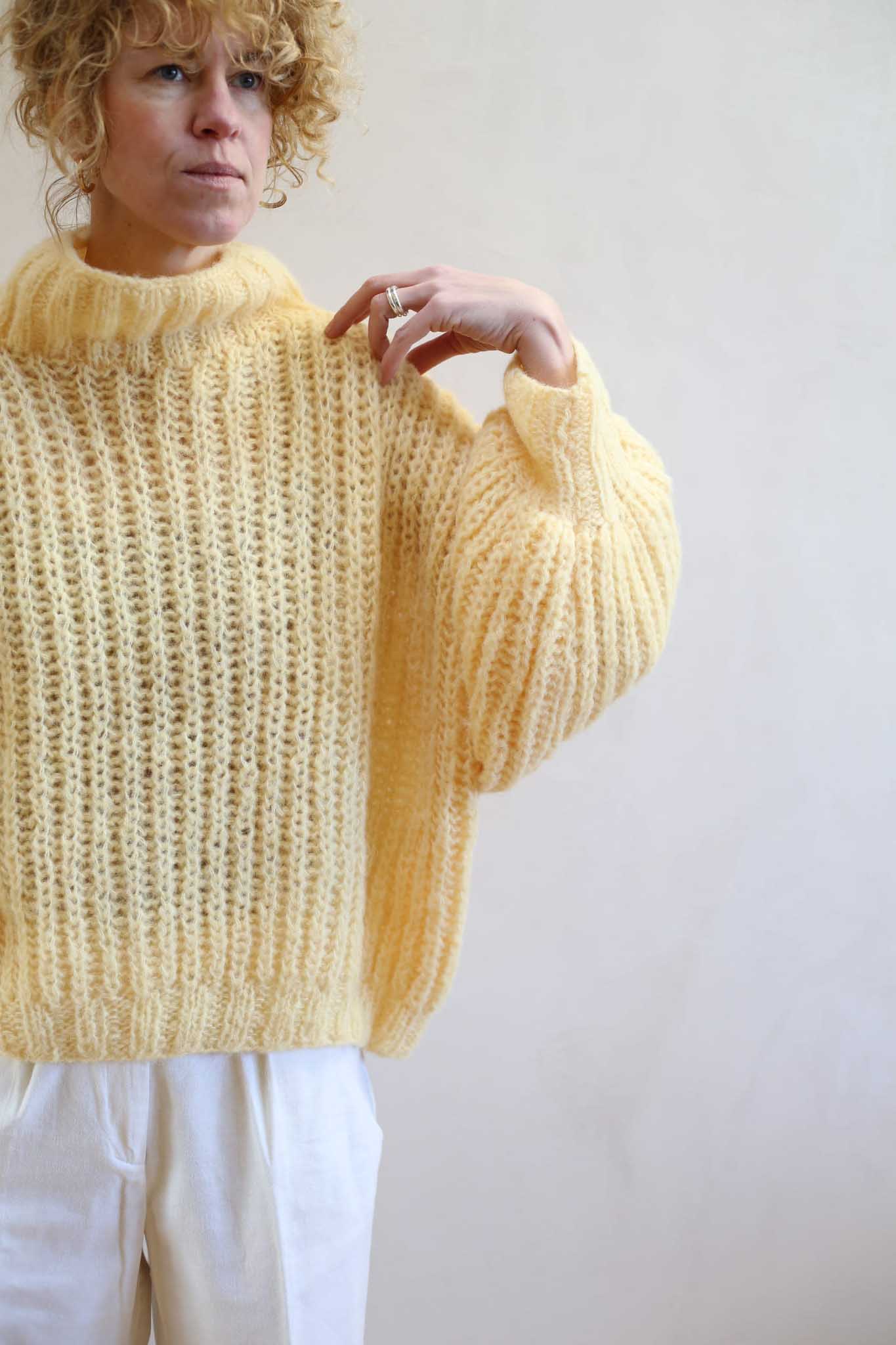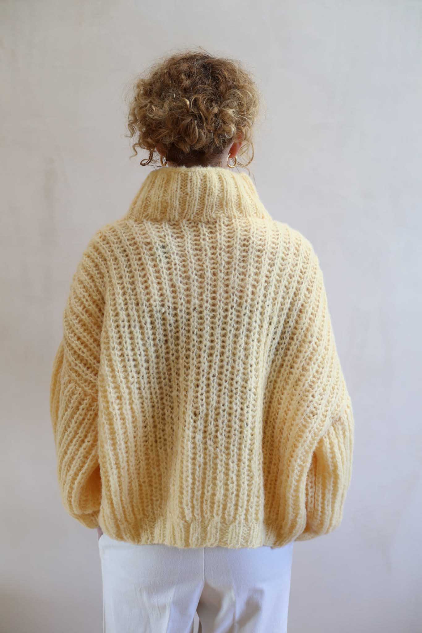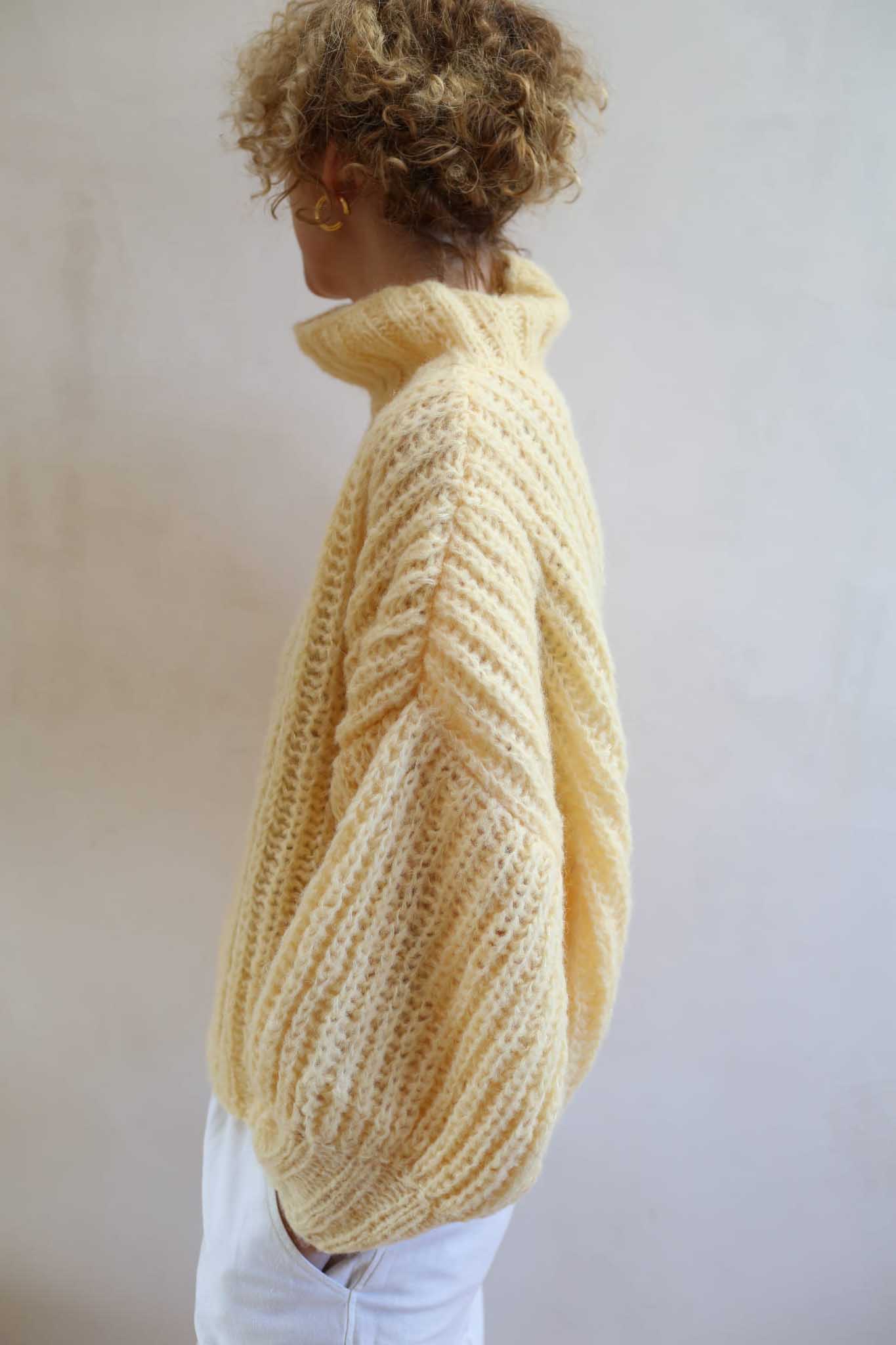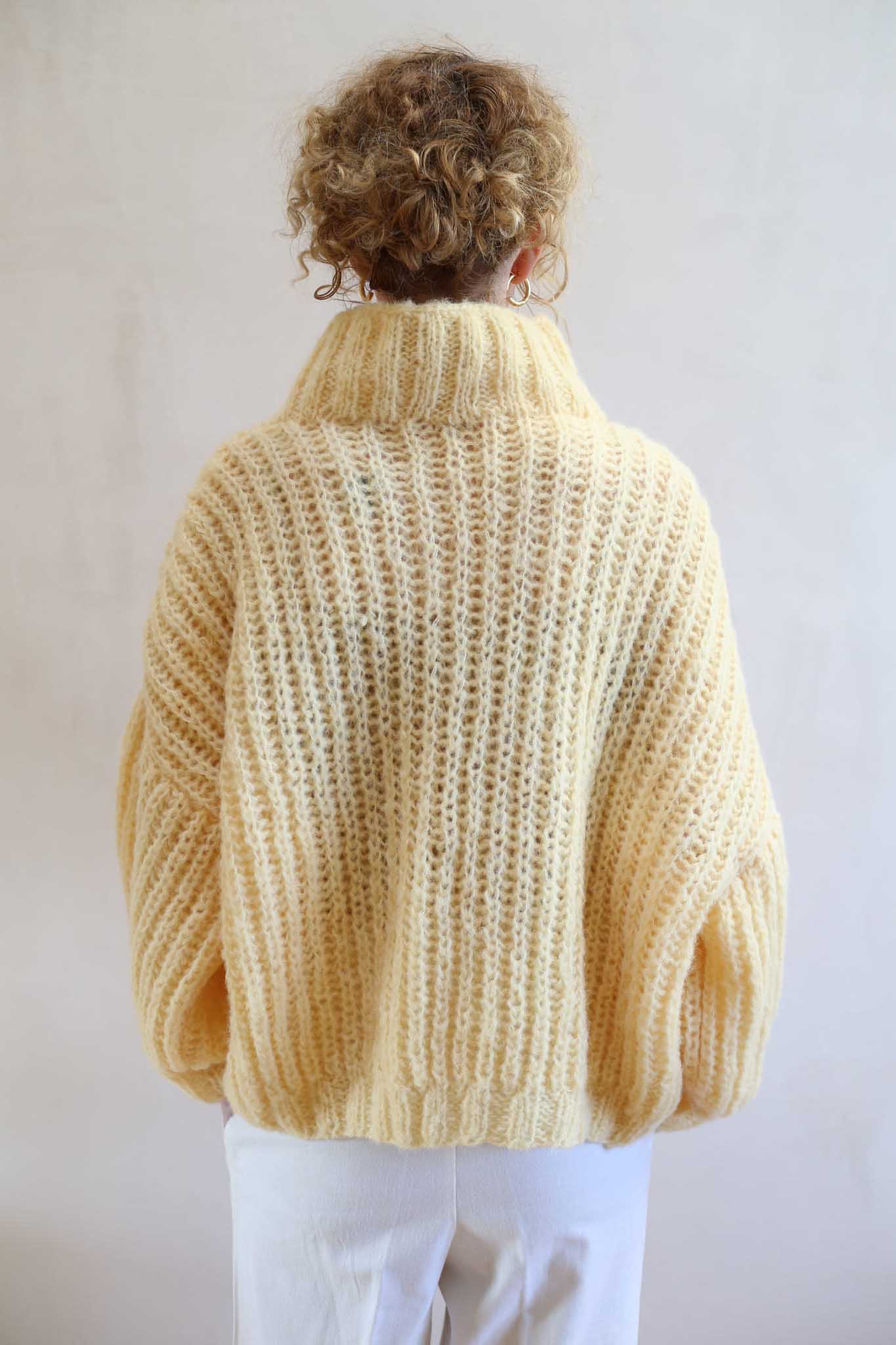 Model Lily Butter to uwspółcześniony, krótki golf z bufiastymi rękawami, długim mankietem, opuszczonymi ramionami i ściągaczem w pasie. Miękki, szlachetny, dzięki puszystej wełnie wygląda bardzo elegancko i ponadczasowo. Jest letnią wersja modelu Lily.