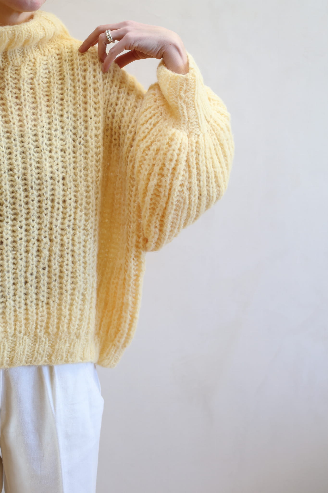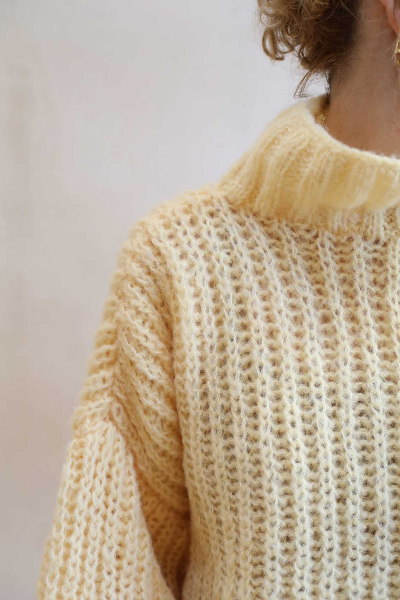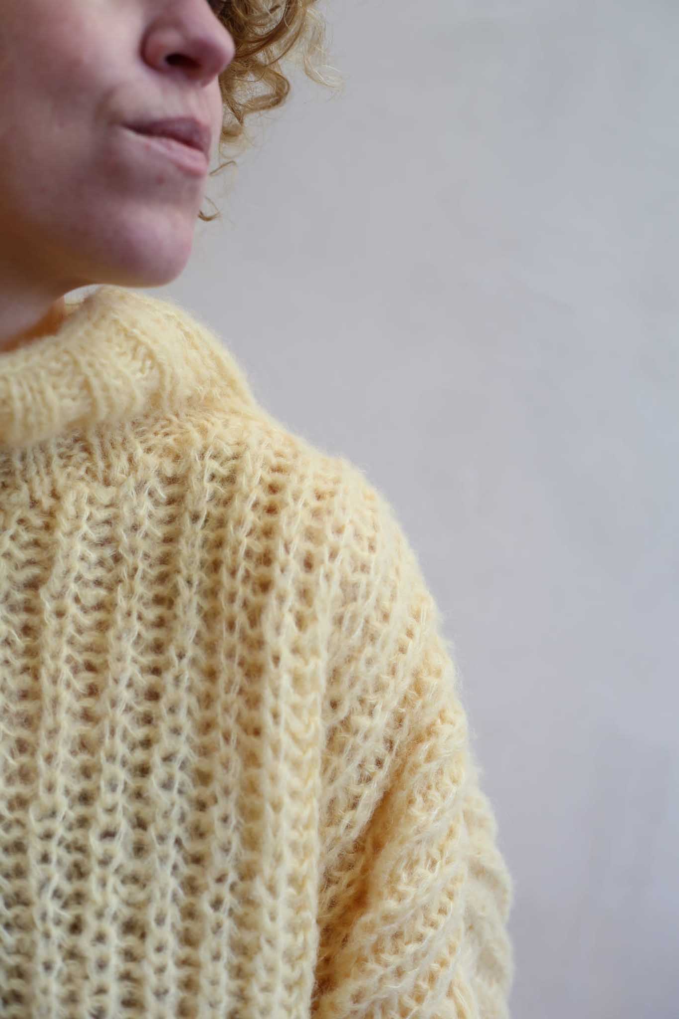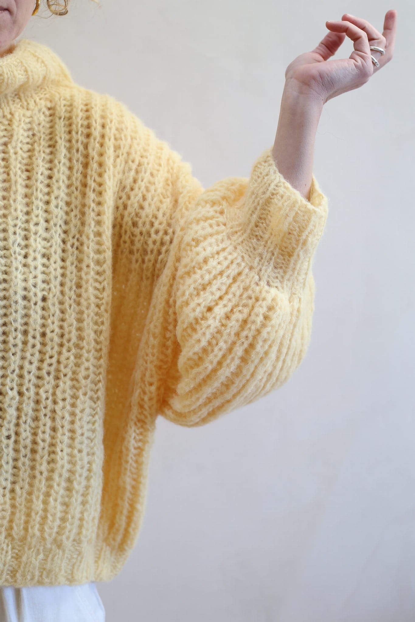 Model Lily Butter to uwspółcześniony, krótki golf z bufiastymi rękawami, długim mankietem, opuszczonymi ramionami i ściągaczem w pasie. Miękki, szlachetny, dzięki puszystej wełnie wygląda bardzo elegancko i ponadczasowo. Jest letnią wersja modelu Lily.