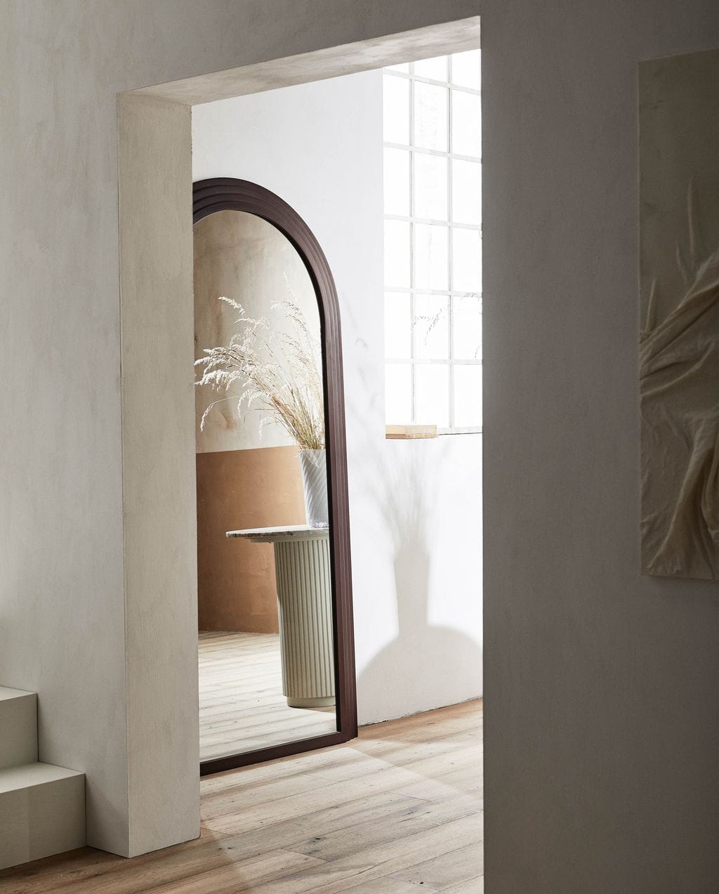 Lustro Falco marki Nordal z metalową ramą w kolorze ciemnobrązowym. Charakterystyczny wygląd w połączeniu z miękkimi liniami sprawia, że lustro Falco jest nie tylko praktyczne, ale także dekoracyjnym punktem w Twoim domu. Lustro, które swoją prostotą wpisuje się zarówno w styl klasyczny, jak i nowoczesny. Zaokrąglona metalowa rama tworzy efekt 3D, a lustro, jako samodzielny element, staje się rzeźbiarskim akcentem w każdym wnętrzu. Falco jest ponadczasowe i stanowi uosobienie estetyki i funkcjonalności idących w parze. Powieś lustro w przedpokoju, salonie lub sypialni albo umieść je na podłodze, opierając się o ścianę, aby uzyskać bardziej osobisty i swobodny wyraz.