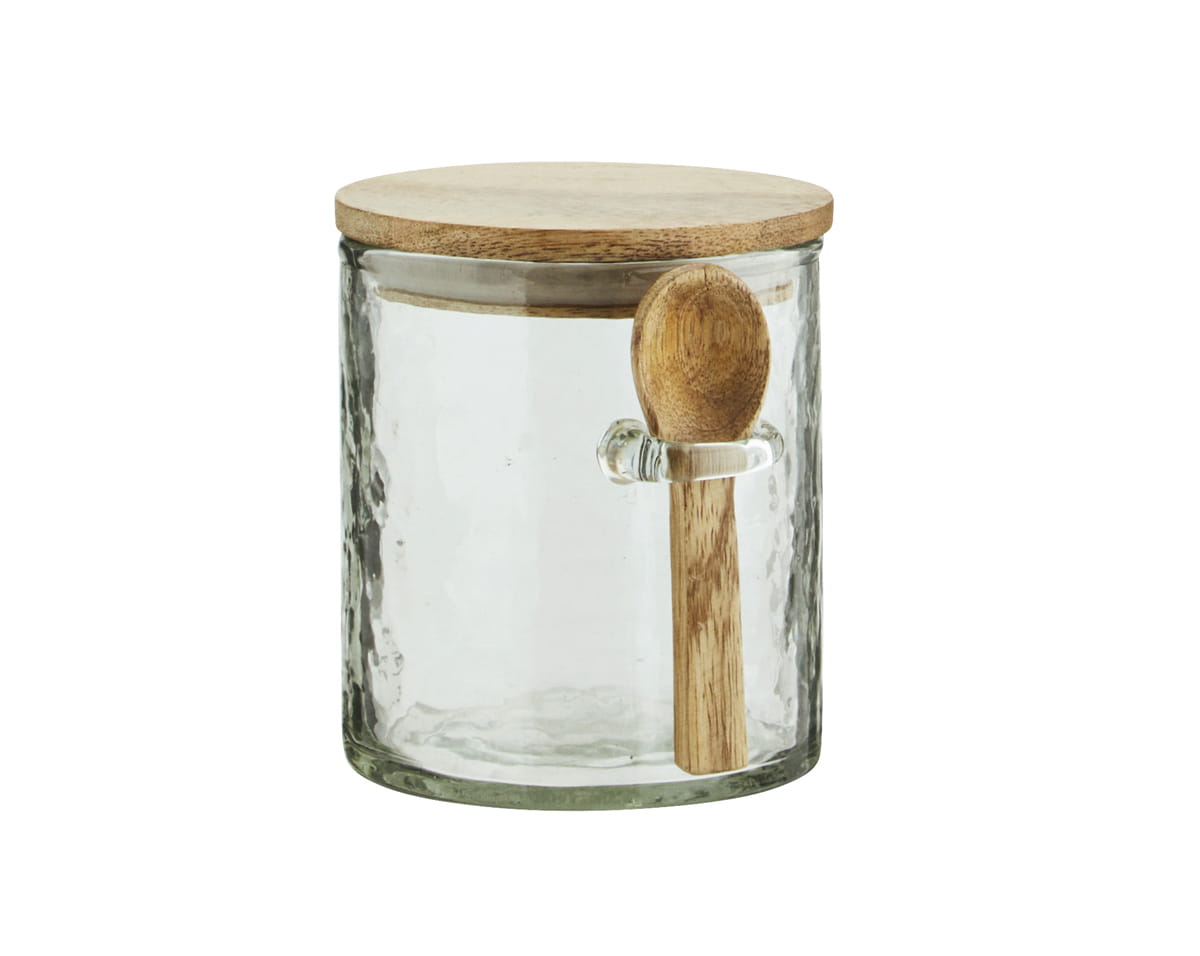 Szklany słój, pojemnik z łyżeczką oraz pokrywką też z drewna do przechowywania żywności marki Madam Stoltz.Pojemnik na żywność od Madam Stoltz. Praktyczna lokalizacja łyżeczki z boku słoika, niema pod ręką. Pojemnik posiada silikonową gumkę pod pokrywką, która zapewnia szczelne zamknięcie i nie wietrzenie zamkniętej wewnątrz żywności. Zalecane jest mycie ręczne elementów drewnianych. Naturalne materiały mogą różnić się kolorem