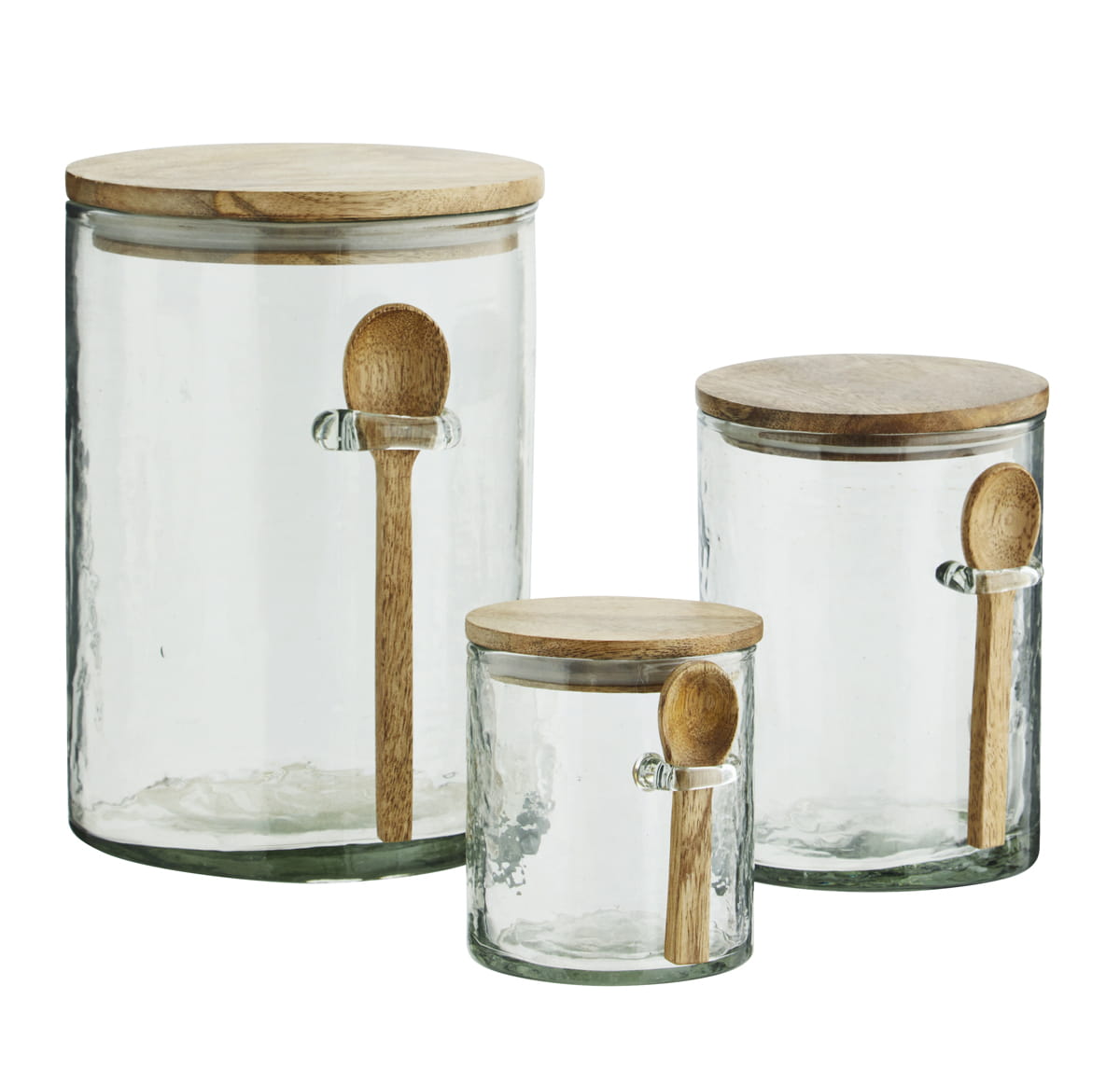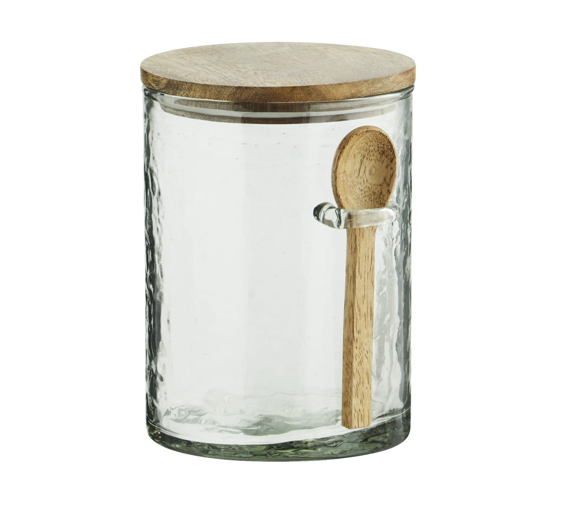 Szklany słój, pojemnik z łyżeczką oraz pokrywką też z drewna do przechowywania żywności marki Madam Stoltz.Pojemnik na żywność od Madam Stoltz. Praktyczna lokalizacja łyżeczki z boku słoika, niema pod ręką. Pojemnik posiada silikonową gumkę pod pokrywką, która zapewnia szczelne zamknięcie i nie wietrzenie zamkniętej wewnątrz żywności. Zalecane jest mycie ręczne elementów drewnianych. Naturalne materiały mogą różnić się kolorem