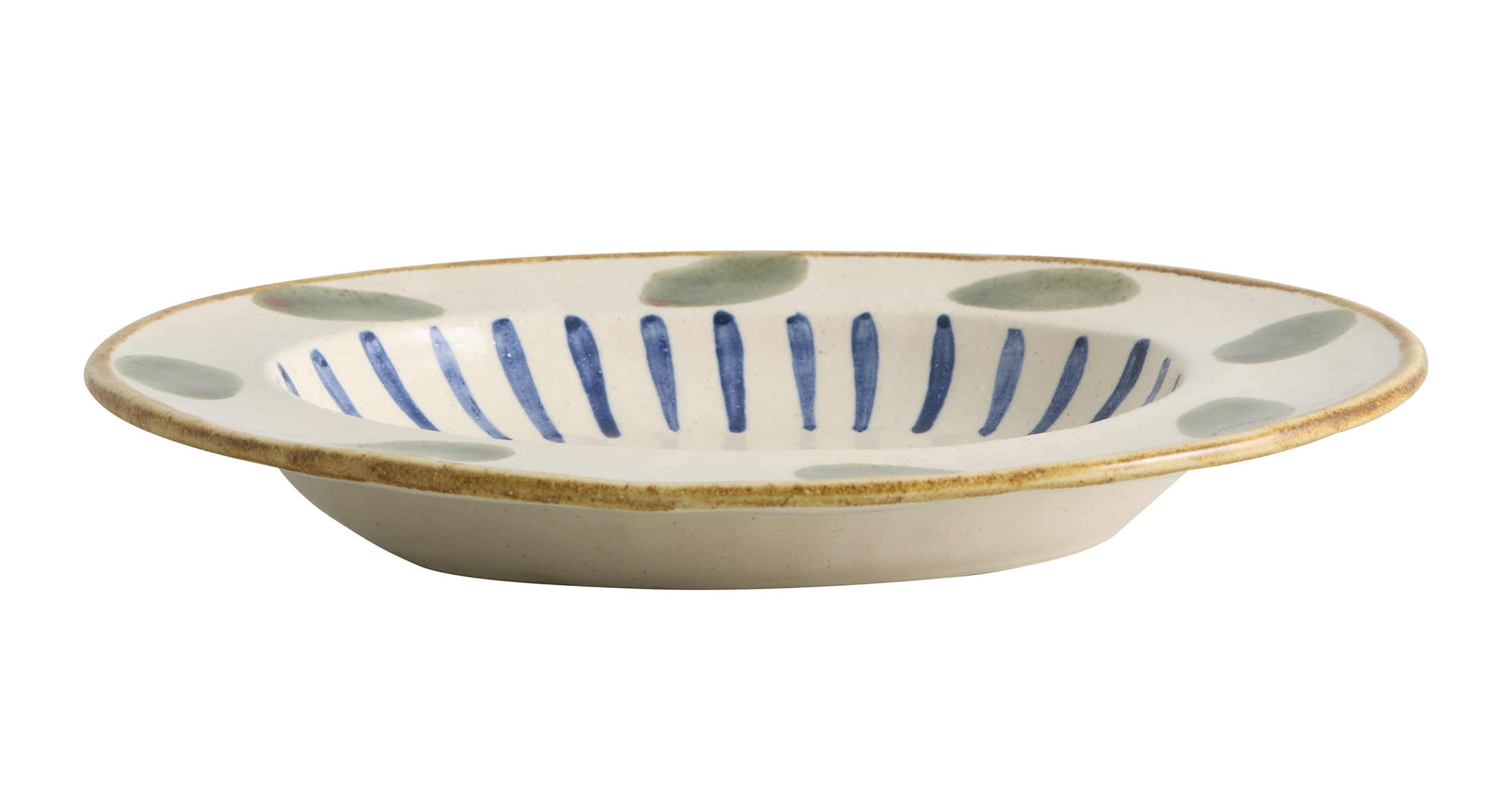 Talerz OLEA od Atelier FORMA wnosi odrobinę rękodzielniczego uroku do każdego nakrycia stołu. Zielone motywy liści oraz ręcznie malowane niebieskie akcenty tworzą żywy, artystyczny wzór, który sprawia, że każdy egzemplarz jest jedyny w swoim rodzaju. Miękko organiczny kształt i złocony rant podkreślają kunszt wykonania, czyniąc OLEA idealnym wyborem zarówno na co dzień, jak i na wyjątkowe okazje. Pojemność: około 250 ml.