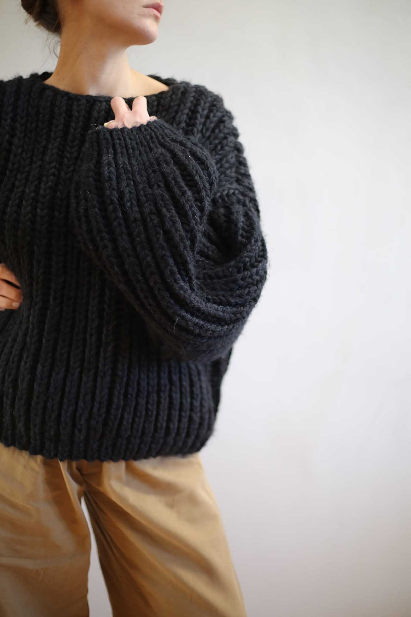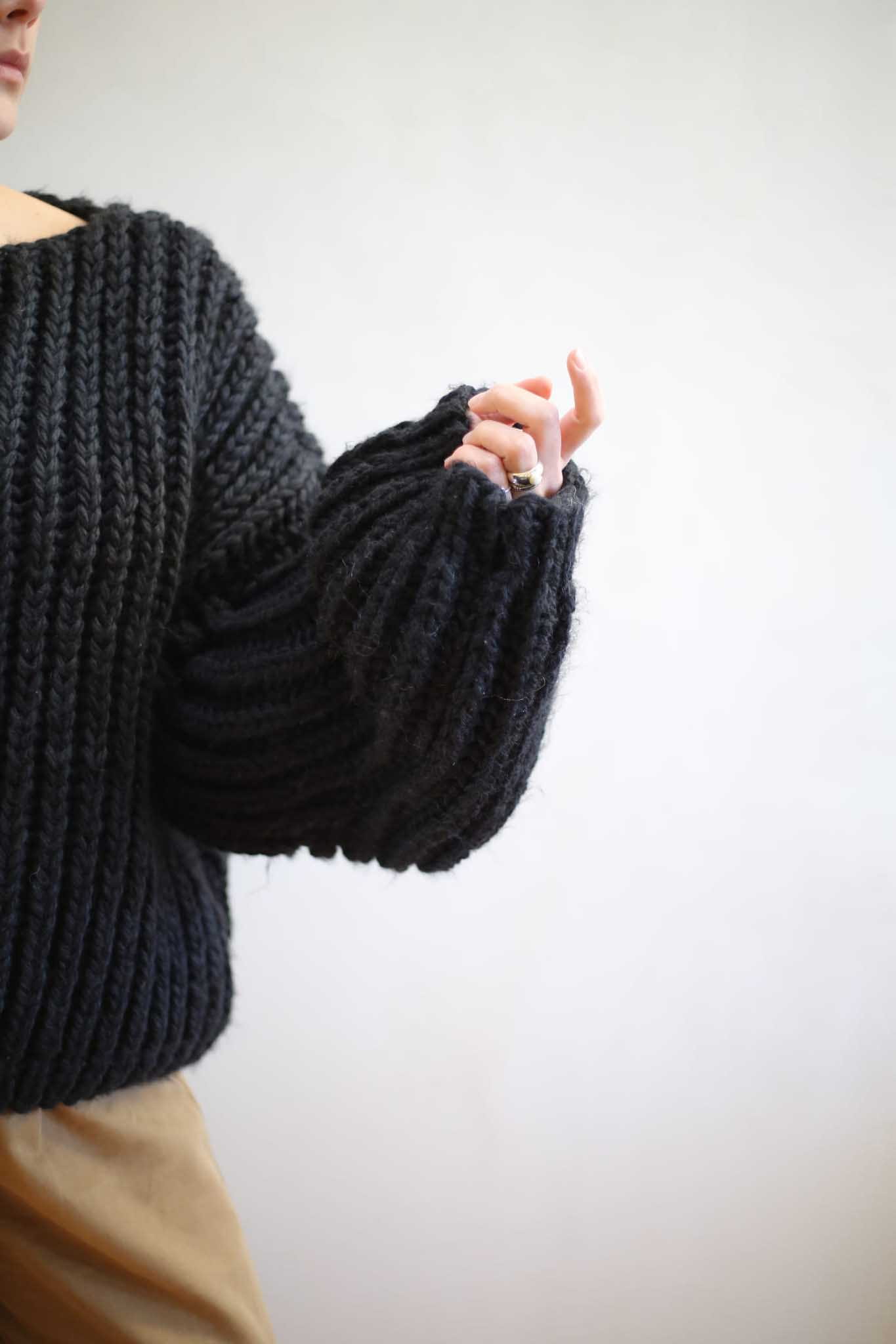 Model Roma wyrazisty sweter z bufiastymi rękawami, opuszczonymi ramionami, dekoltem w łódkę. Ma pudełkowy kształt i przeskalowaną formę.