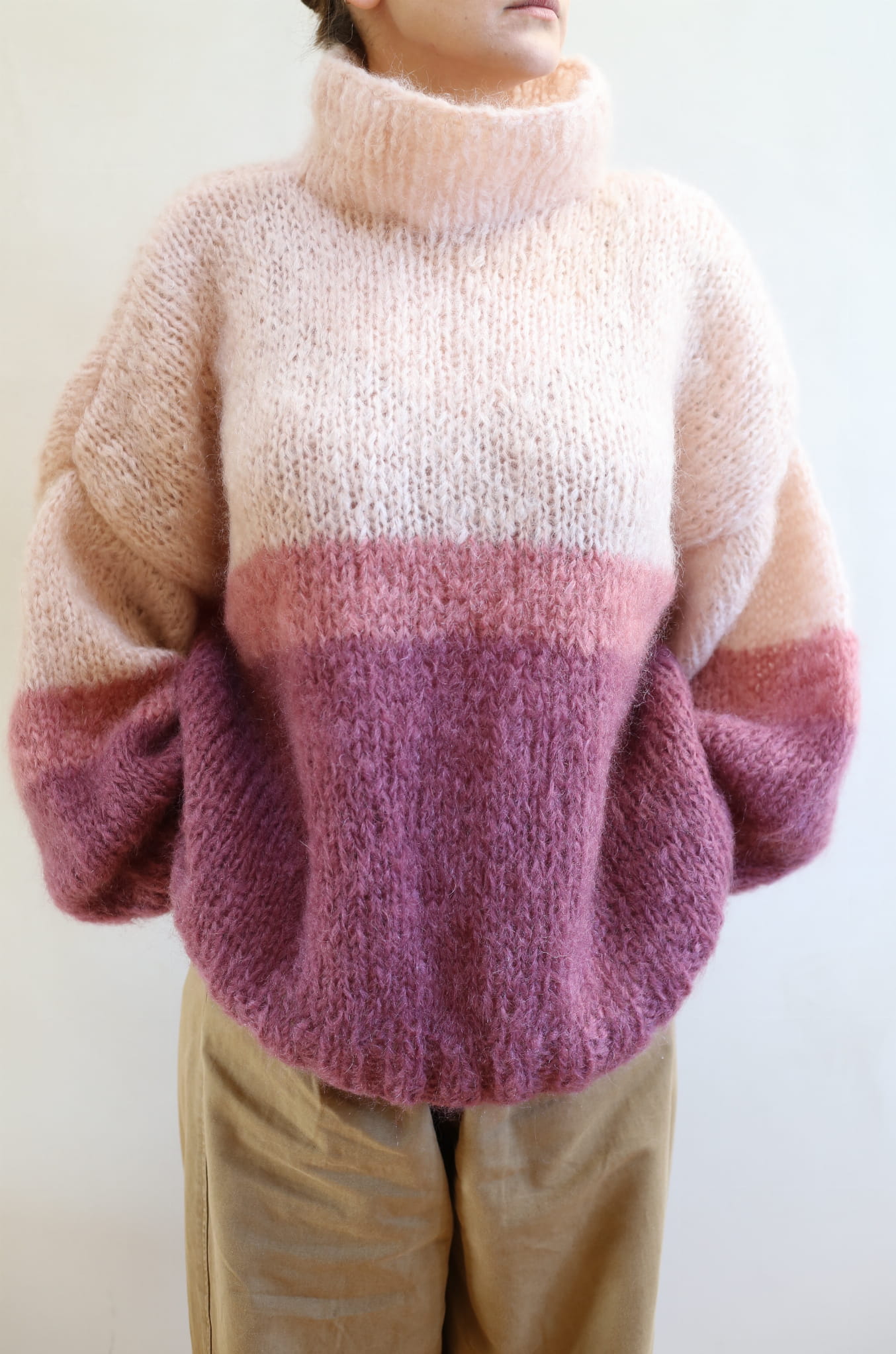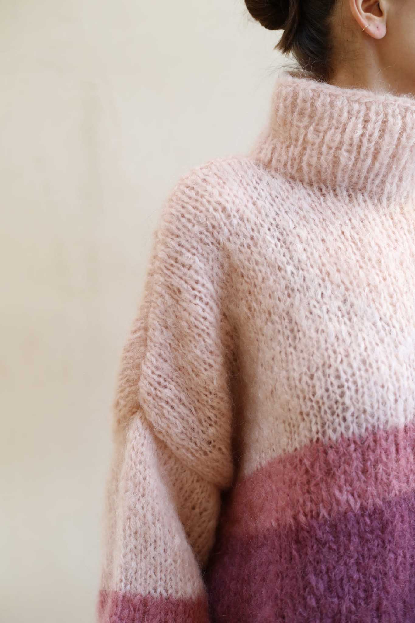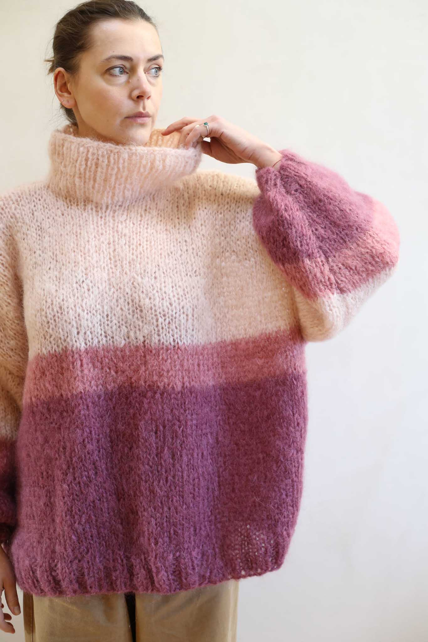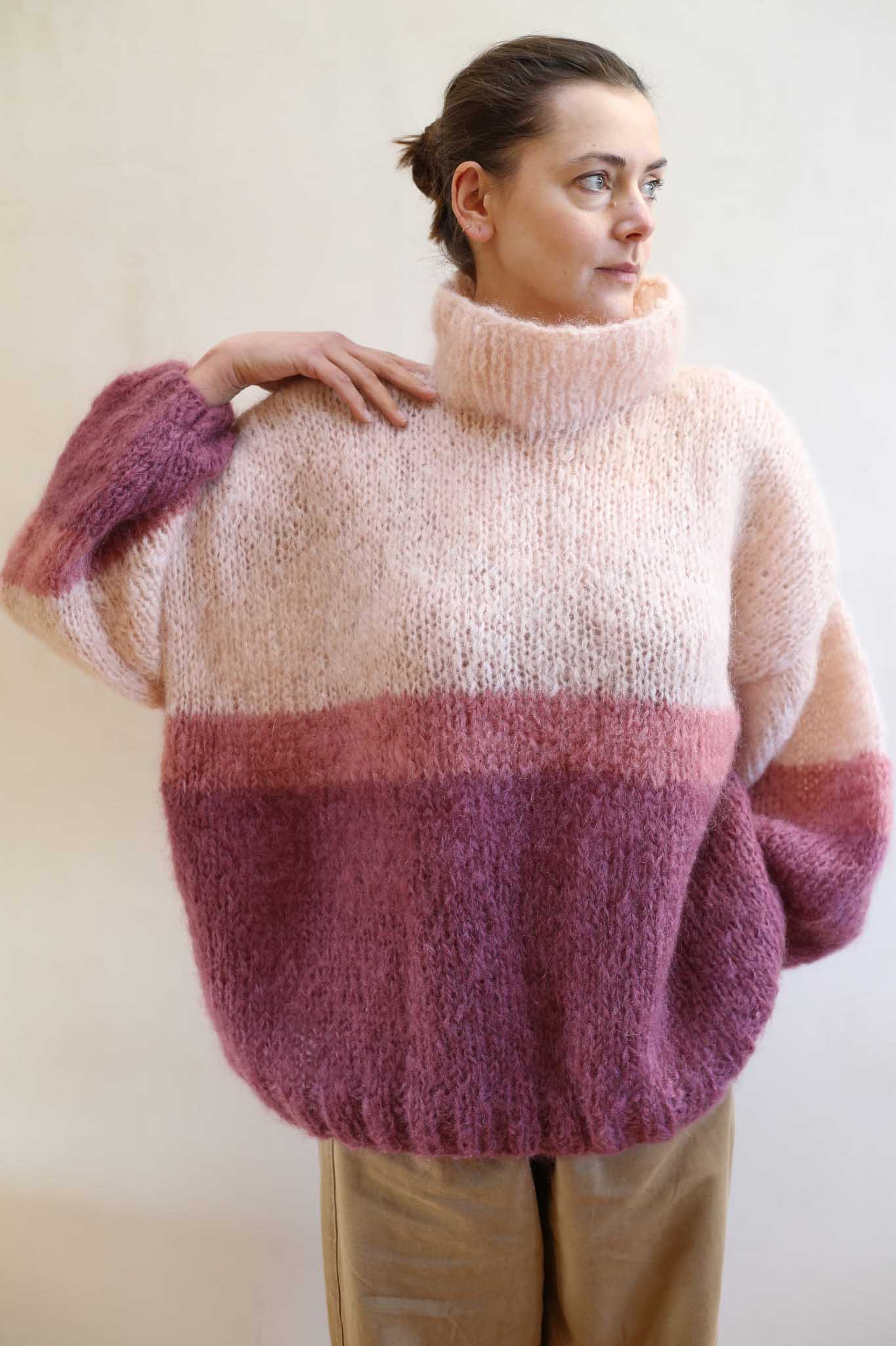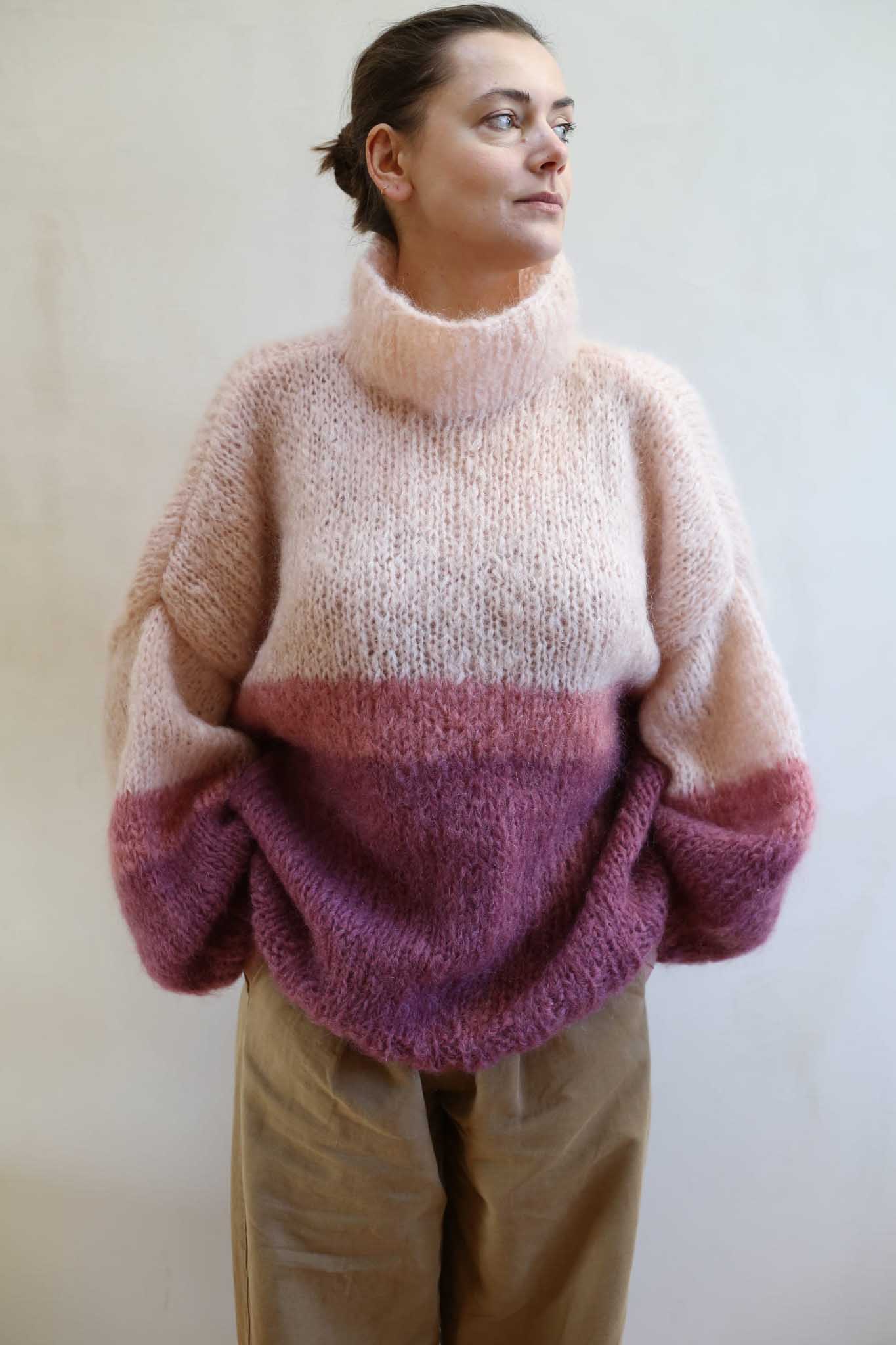 Model Sofia to obszerny a jednak wizualnie lekki golf wykończony różnymi tonacjami różu. Przy twarzy jest ta najjaśniejsza i świetlista barwa, która działa jak róż w makijażu. Dodaje uroku i blasku. Ten sweter ma luźne, zwieńczone wąskim mankietem rękawy. Dzięki takiej konstrukcji wygląda bardzo kobieco i nowocześnie zarazem. Jest lekki, miękki, otulający. Mimo subtelnych kolorów jest charakterystyczny i wyrazisty.