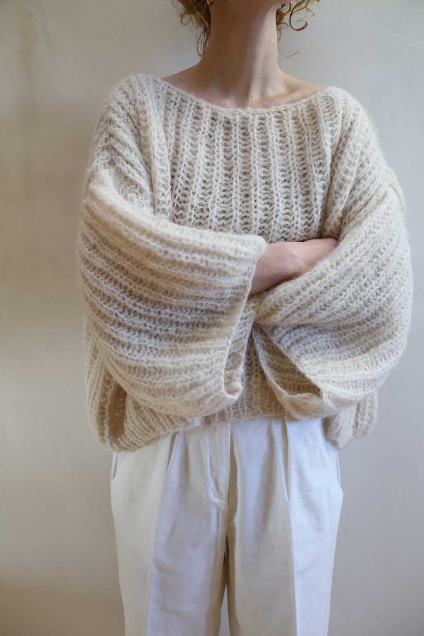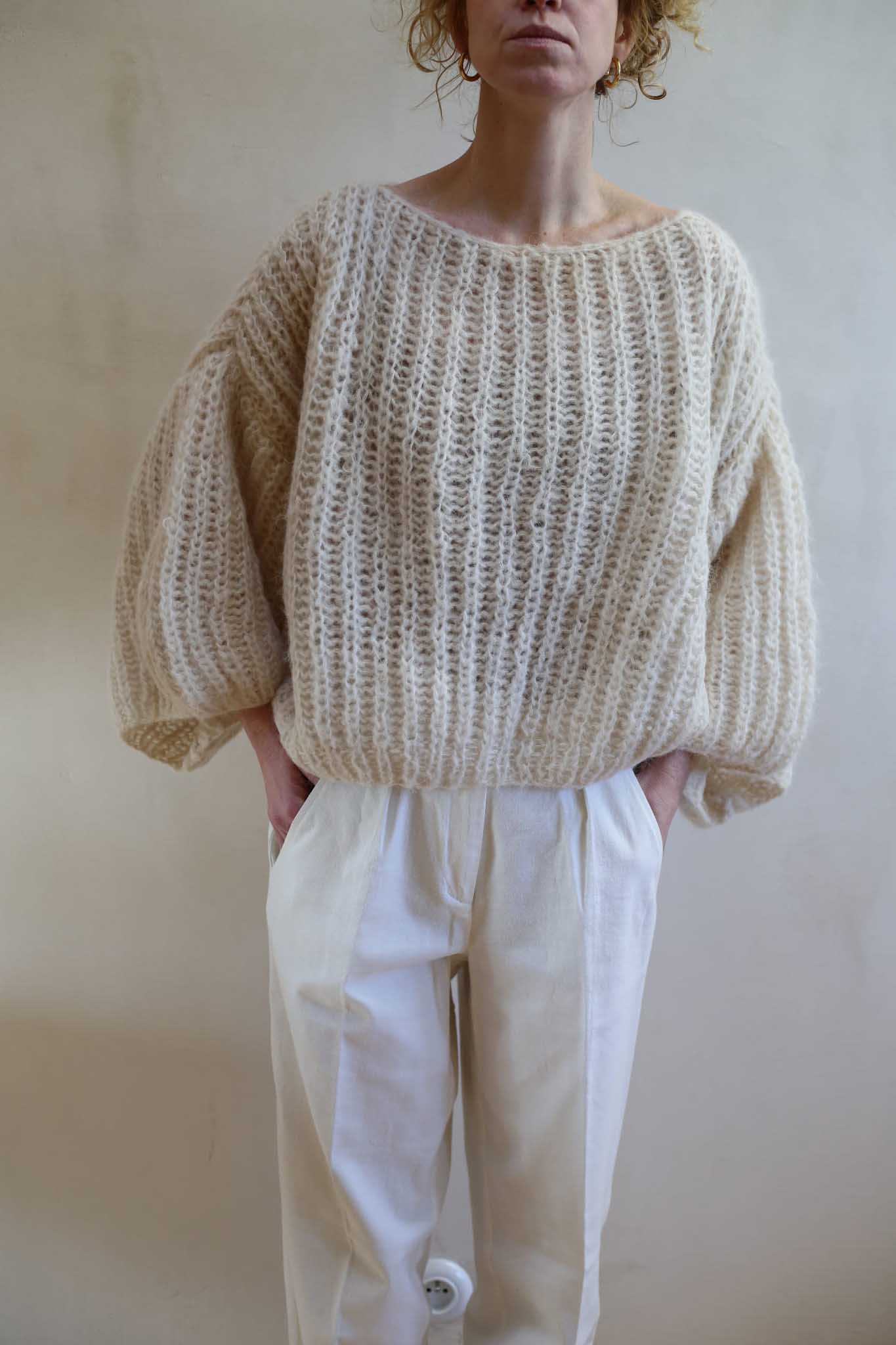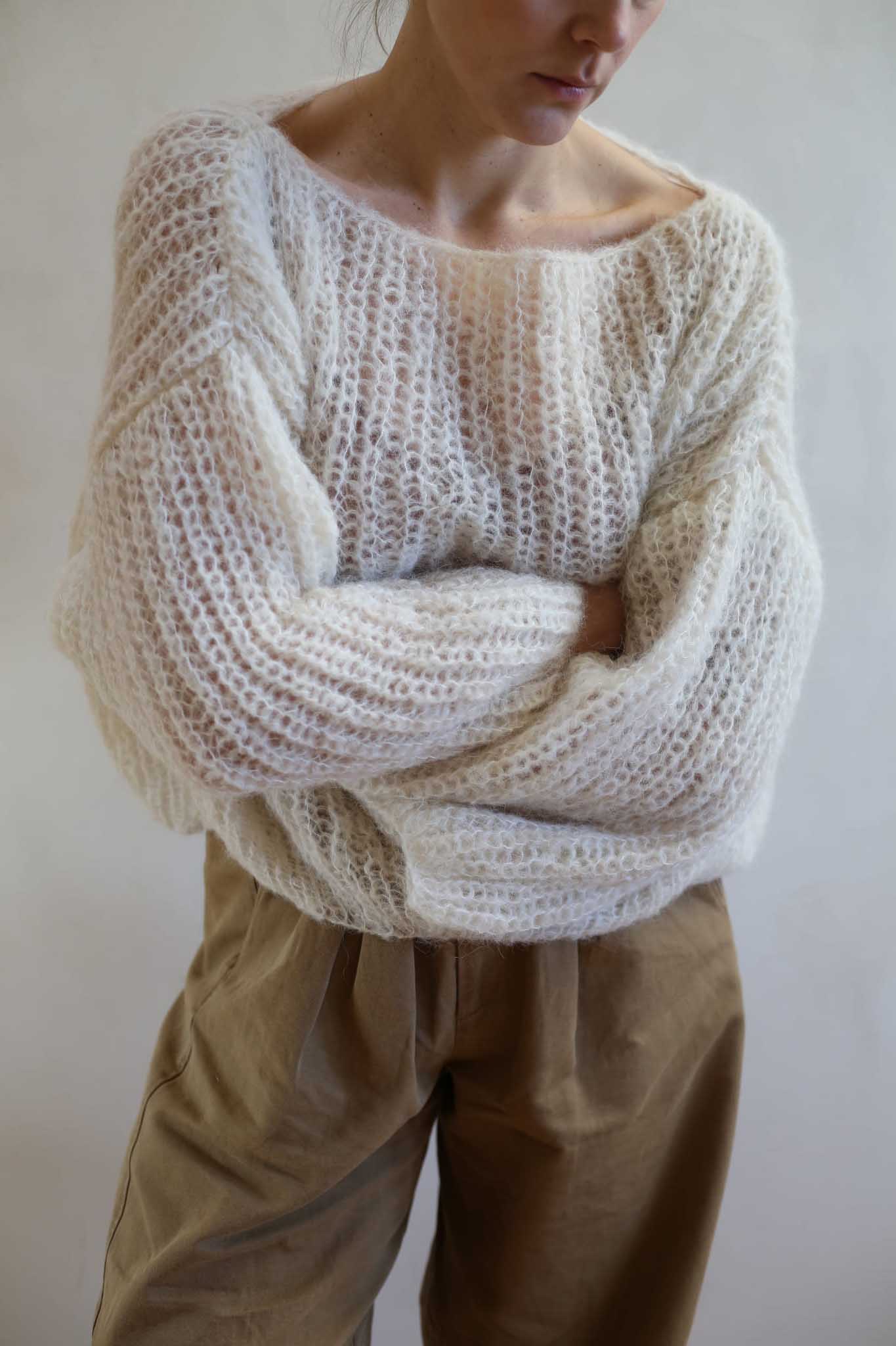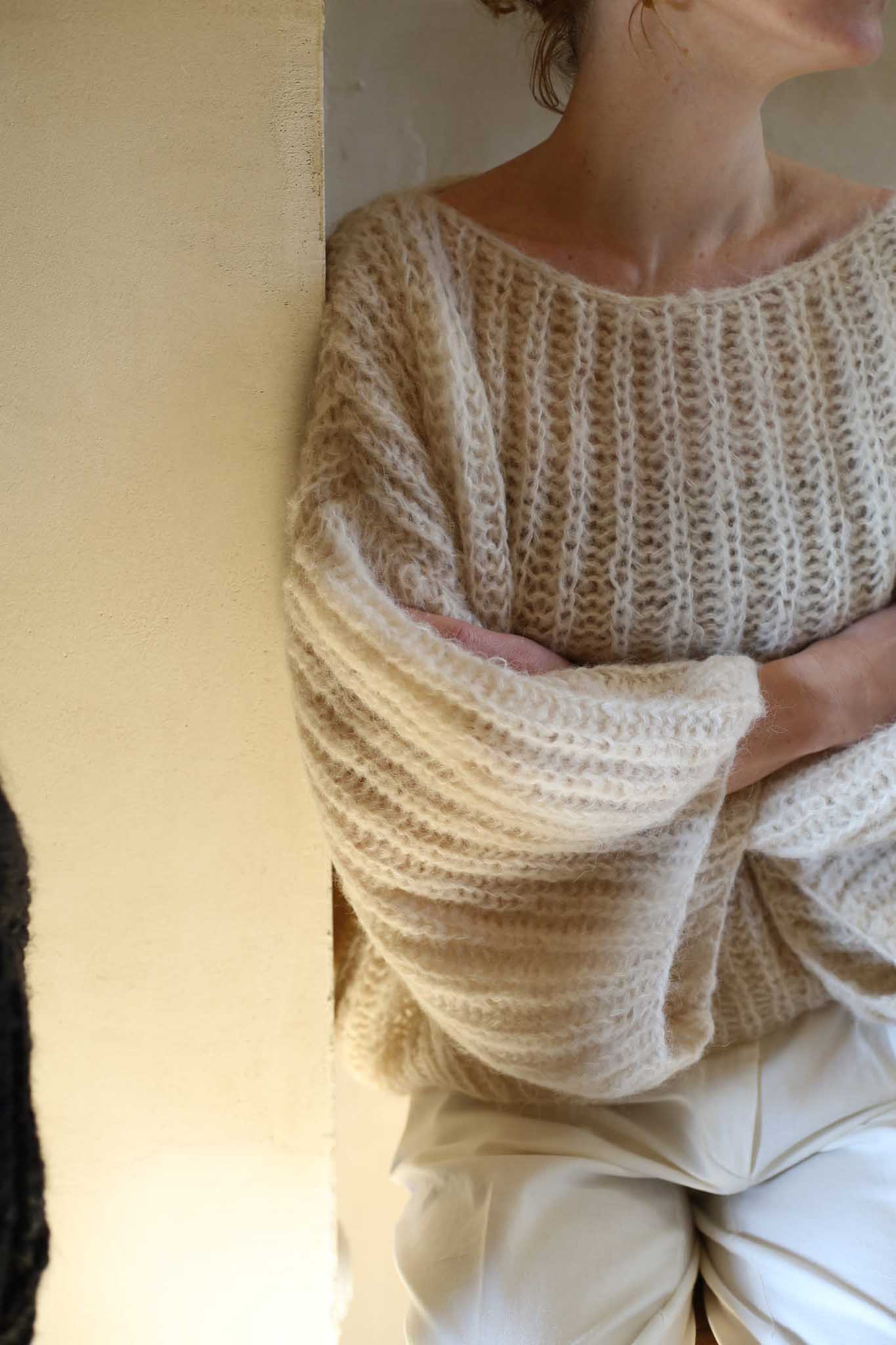 Model Teresa to lekki sweter z szerokimi rękawami 7/8, dekoltem w łódkę, opuszczonymi ramionami i delikatnym ściągaczem w pasie. Miękki i szlachetny w odbiorze dzięki puszystej wełnie. Wygląda bardzo elegancko i ponadczasowo. Pasuje do zwiewnych spódnic, jak i klasycznych jeansów. Ten model ma prostą, minimalistyczną konstrukcję. Dodaje mu to nowoczesnej elegancji.