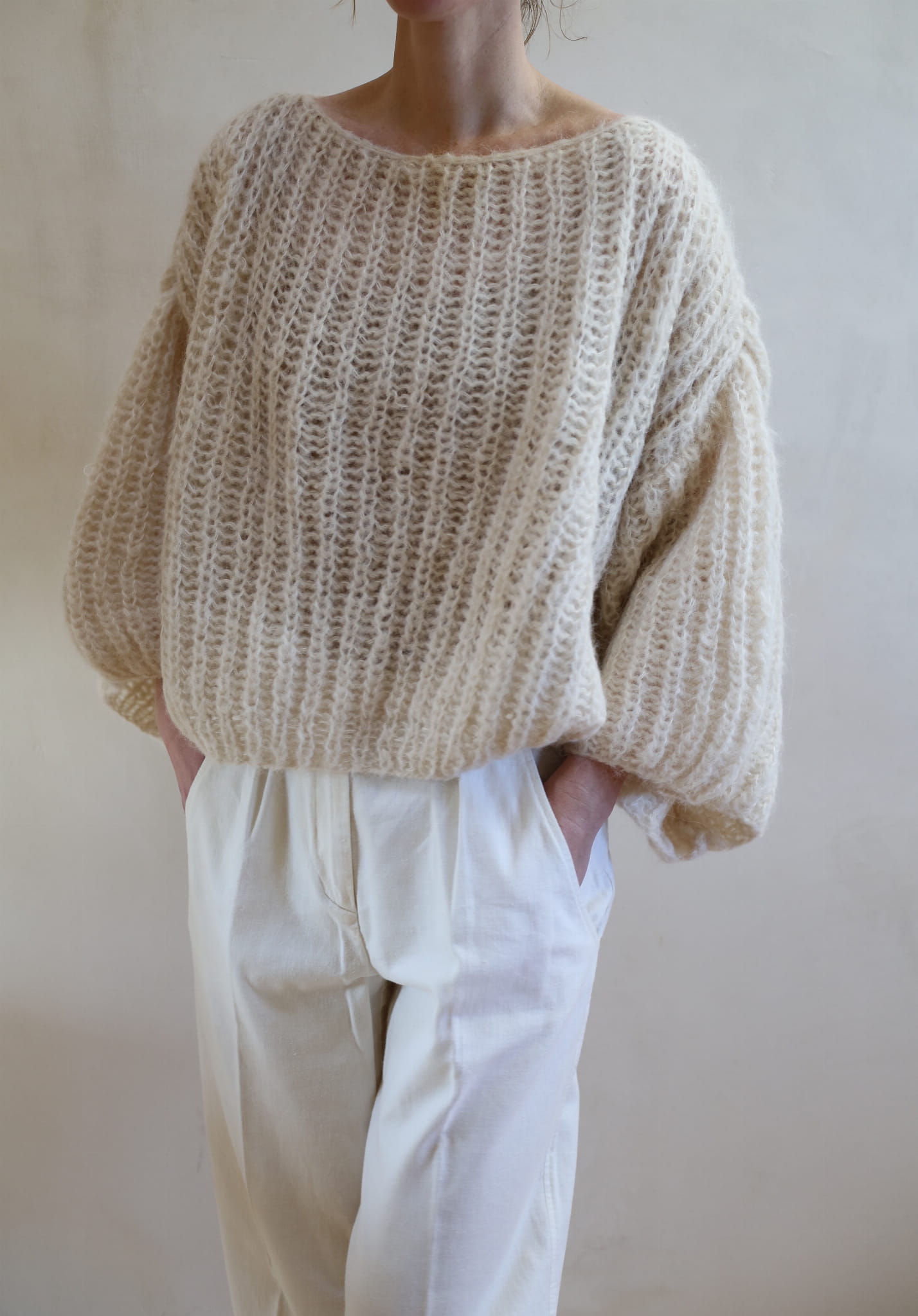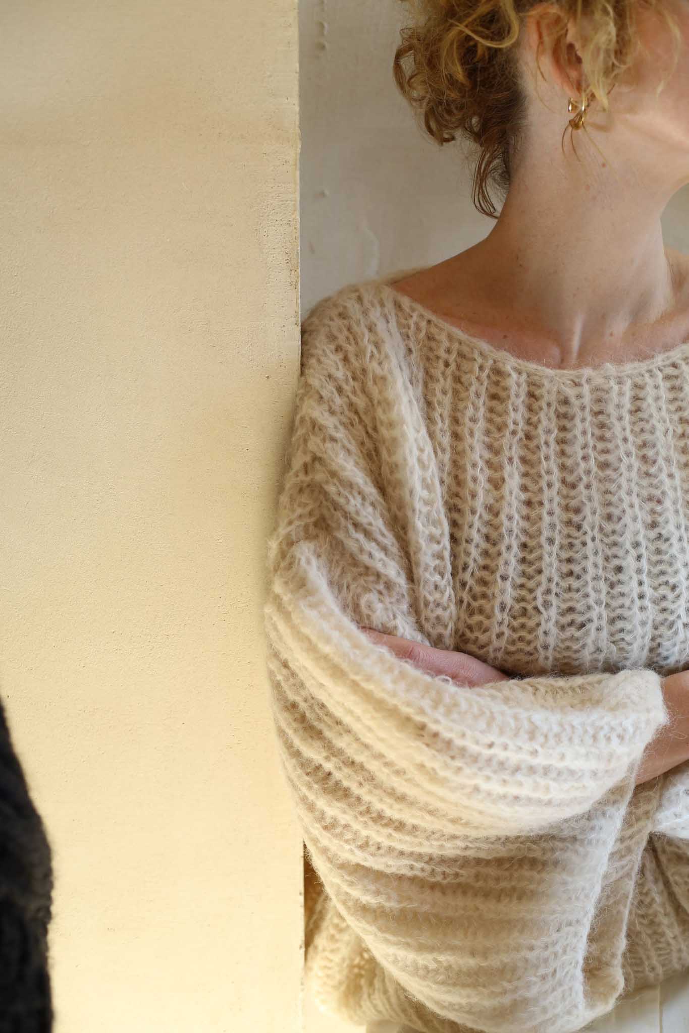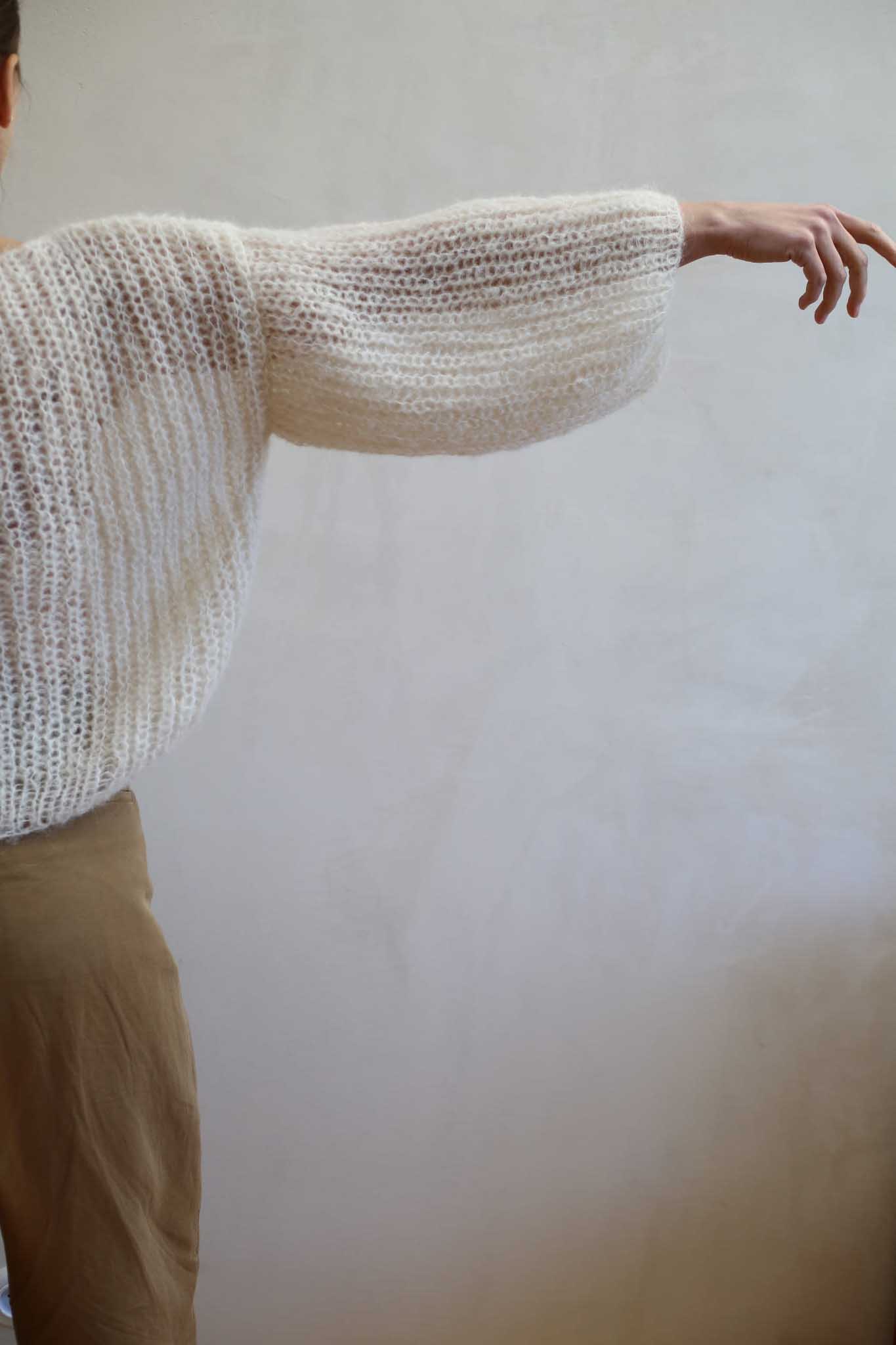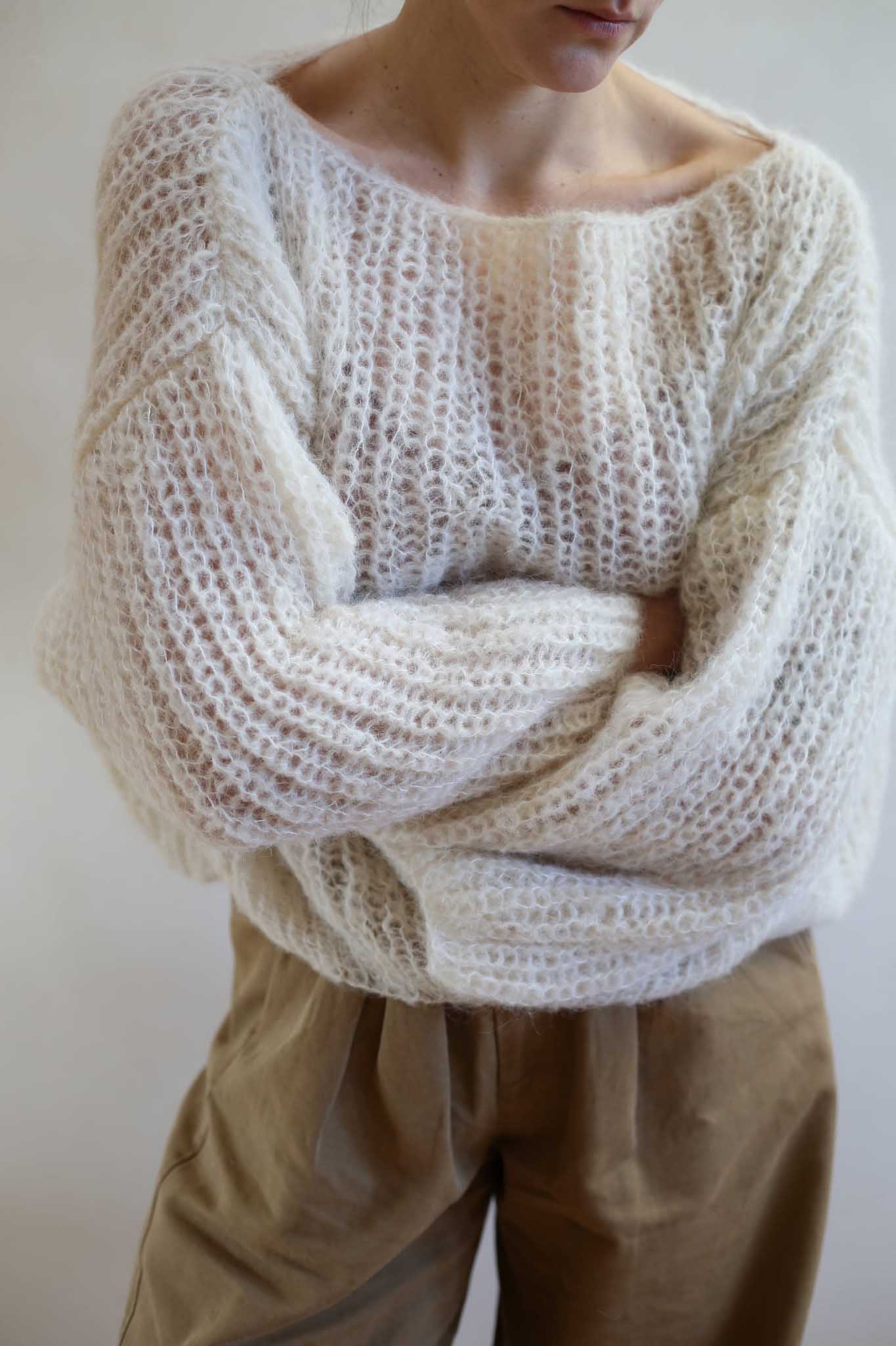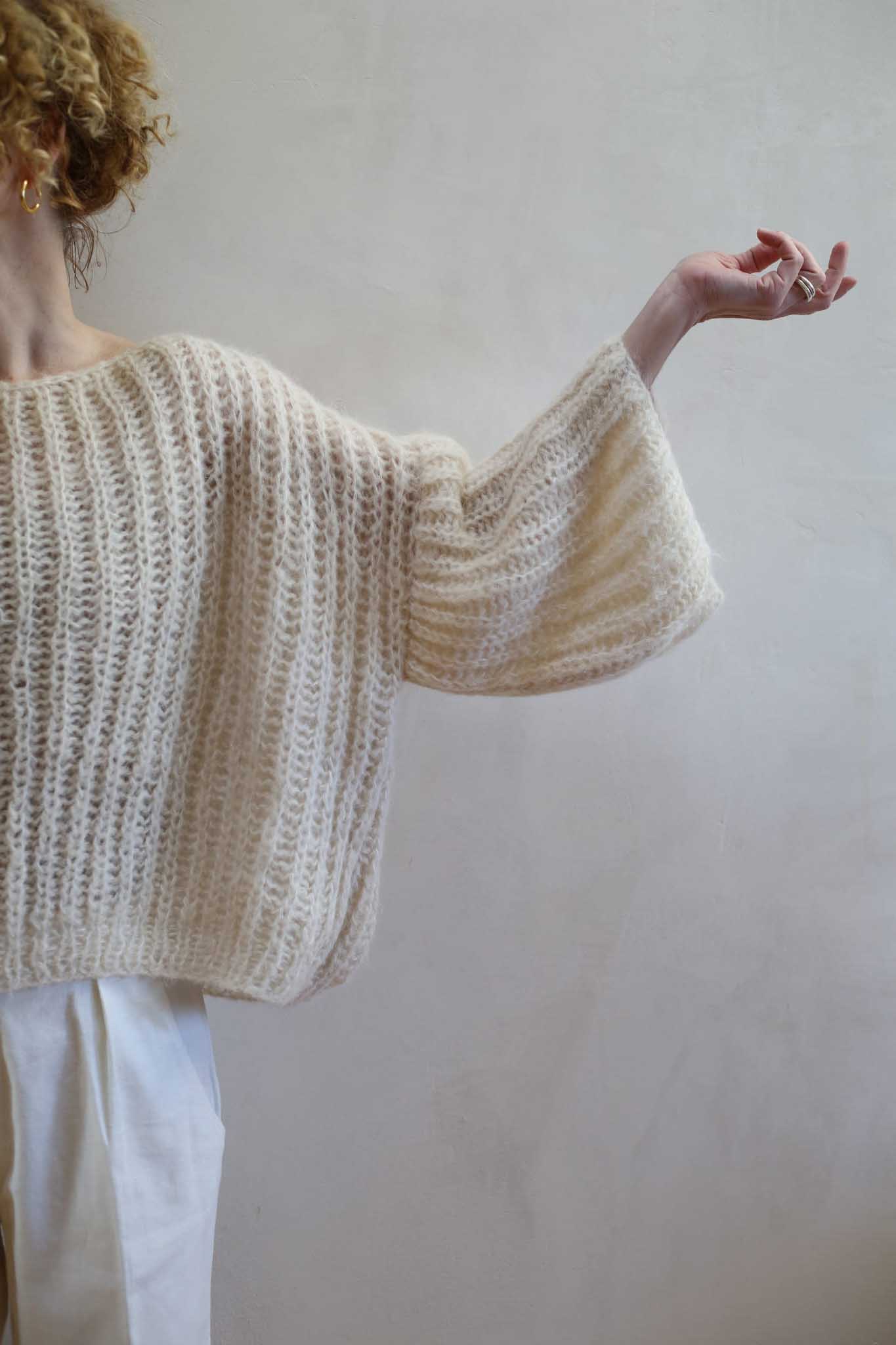 Model Teresa to lekki sweter z szerokimi rękawami 7/8, dekoltem w łódkę, opuszczonymi ramionami i delikatnym ściągaczem w pasie. Miękki i szlachetny w odbiorze dzięki puszystej wełnie. Wygląda bardzo elegancko i ponadczasowo. Pasuje do zwiewnych spódnic, jak i klasycznych jeansów. Ten model ma prostą, minimalistyczną konstrukcję. Dodaje mu to nowoczesnej elegancji.