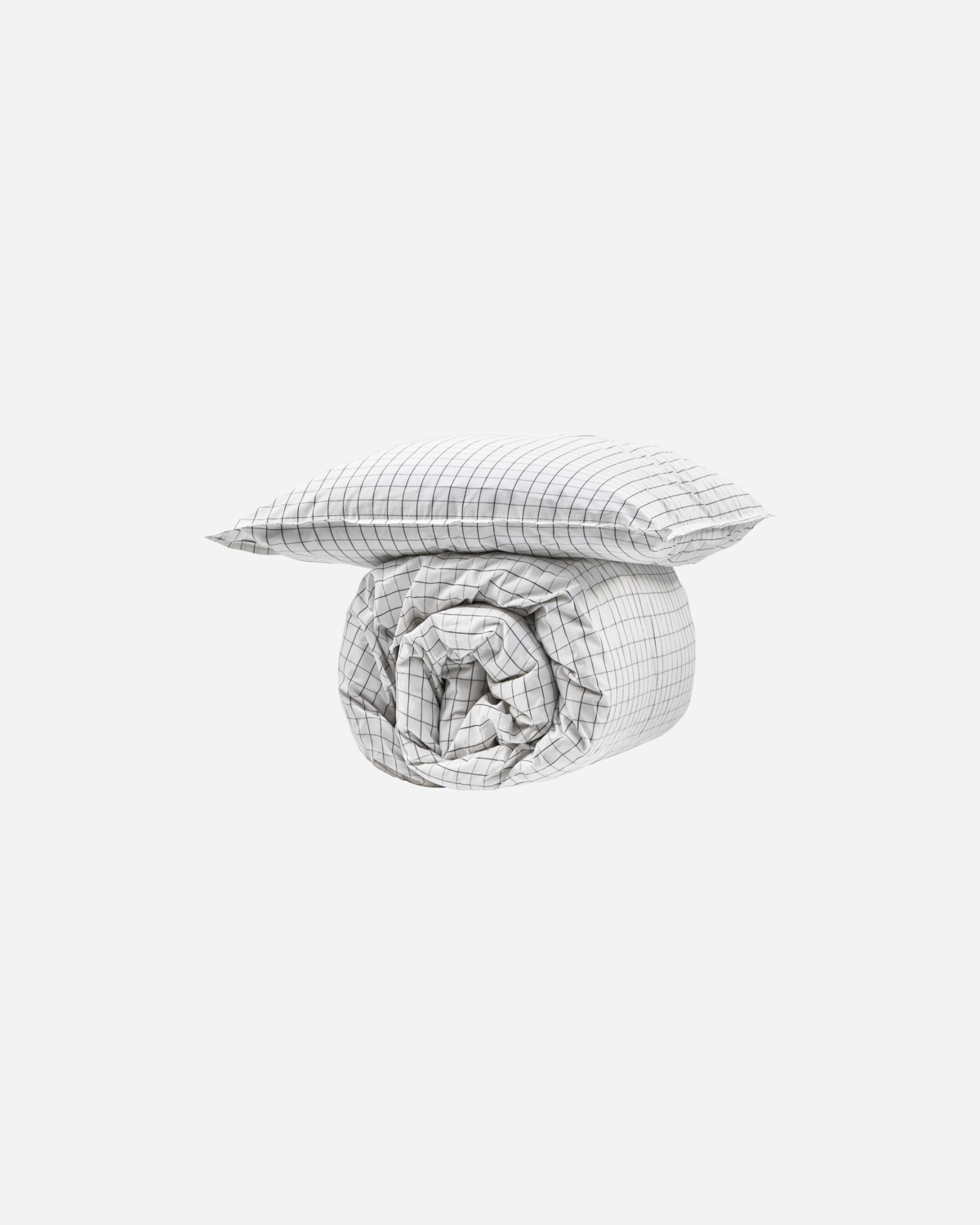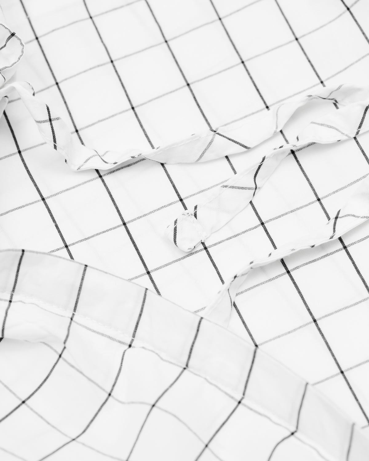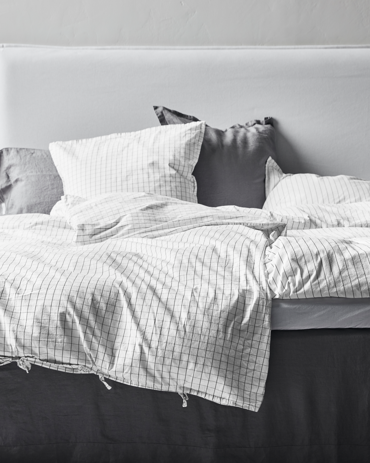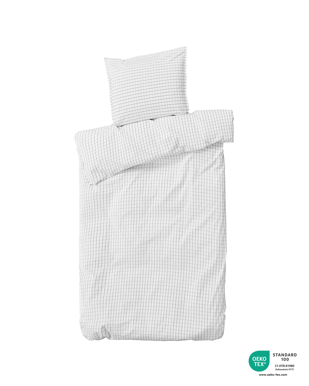 Komplet pościli BNErica. Obudź się odświeżony i pełen energii dzięki świeżej i oddychającej pościeli. Pościel BNErika składa się z pojedynczej poszwy na kołdrę z zapięciem kopertowym i wiązaniem, a poszewka na poduszkę z zapięciem kopertowym. Wykonana z organicznej bawełny z certyfikatem OEKO-TEX® 100 o gęstym splocie perkalowym, zapewnia trwałą i oddychającą pościel na lata. Pranie enzymatyczne sprawia, że biała tkanina w ciemną kratkę jest jeszcze bardziej miękka i dodaje luksusowego komfortu. Nadaj swojej sypialni relaksującą atmosferę dzięki subtelnym detalom i zapewnij sobie dobry sen dzięki tej pościeli od byNOR.